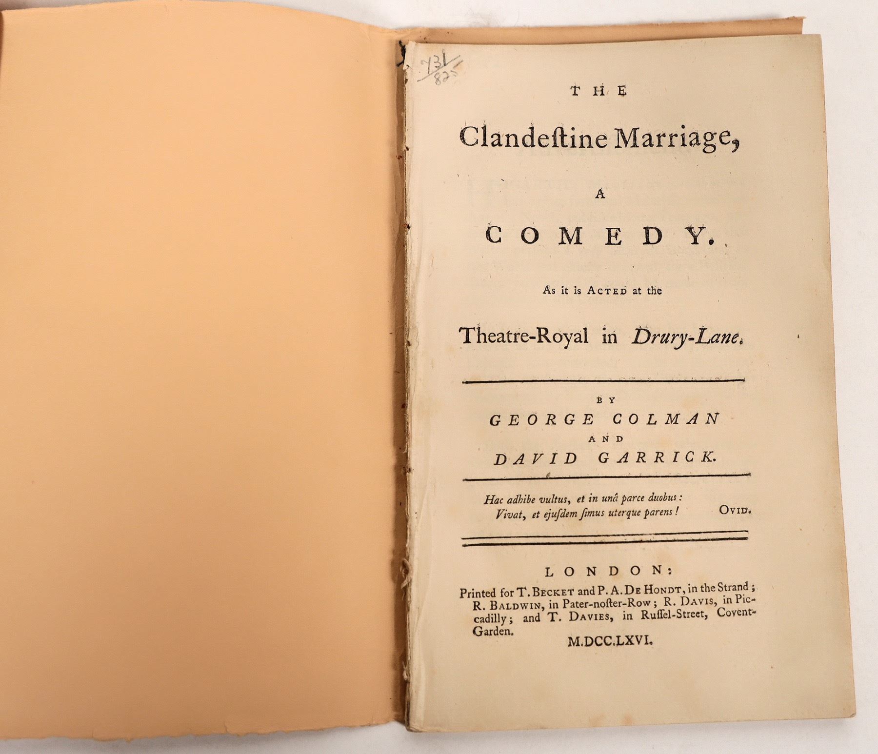 The Clandestine Marriage is a comedy by George Colman the Elder and David Garrick, first performed in 1766 at Drury Lane. It is both a comedy of manners and a comedy of errors. The idea came from a series of pictures by William Hogarth entitled Marriage ‡-la-mode. Soft cover edition 8.5"x 5.5" and has some bleed through pages, but still very readable. Please see photos for more details.