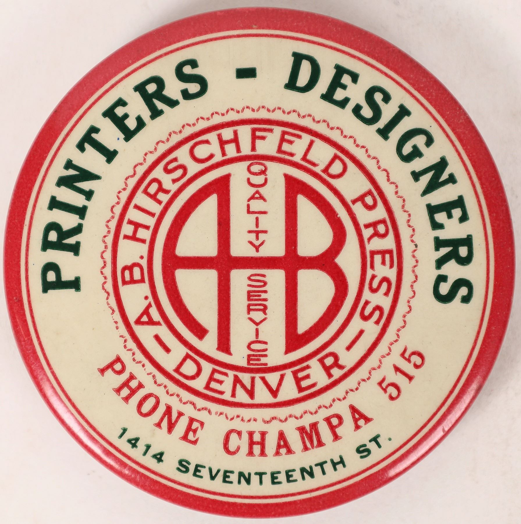 Red and black, 65 mm, advertising mirror. Printers - Designers / A. B. Hirschfeld Press / Denver / Quality Service / Phone Champa 515 / 1414 Seventeenth St. Colorado Denver