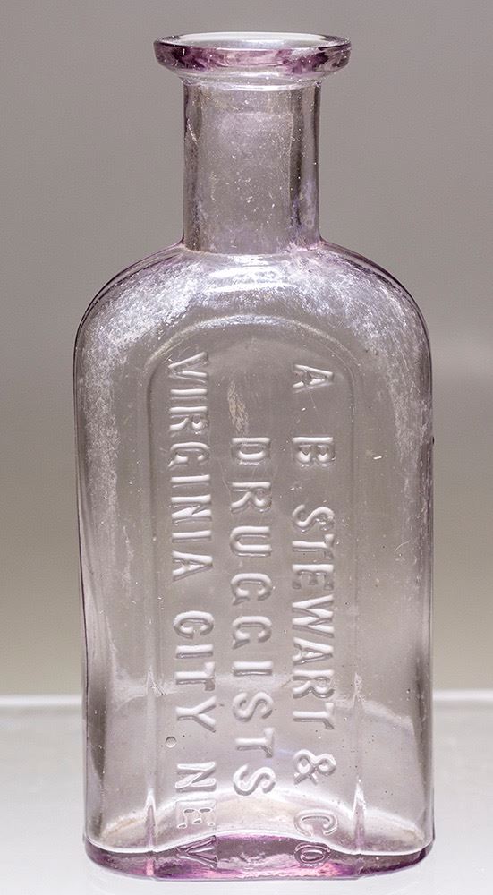 4" tall. Clean, light purple, dead mint. One of the rarest of all the Virginia City bottles. The Virginia City Stewart bottles were only made in 1877. This one is the rarest of two varieties, without the monogram, and only two known to the author. See Nevada Bottle Book Volume II pages 321-330 for complete historical timeline of the Nevada mining camp millionaire Alexander B. Stewart and his drug store bottles. Date: 1877 Location: Virginia City, Nevada HWAC# 571642