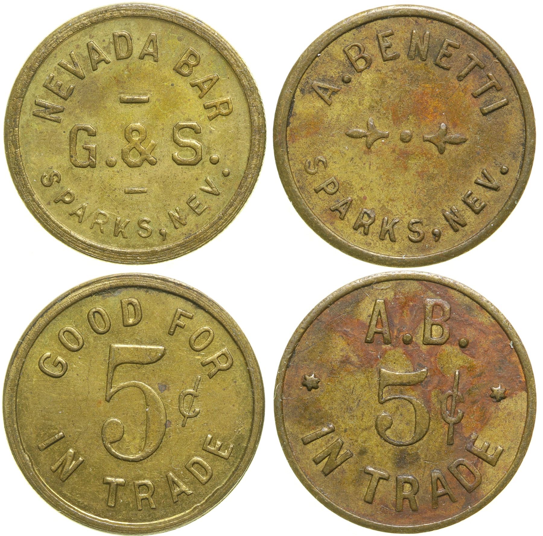 Lot of two: 1) A. Benetti / Sparks, Nev // A.B. / 5c / In Trade; Br., rd., 21 mm. 2) Nevada Bar / G & S / Sparks, Nev. // Good For / 5c / In Trade. Br., rd., 21 mm.