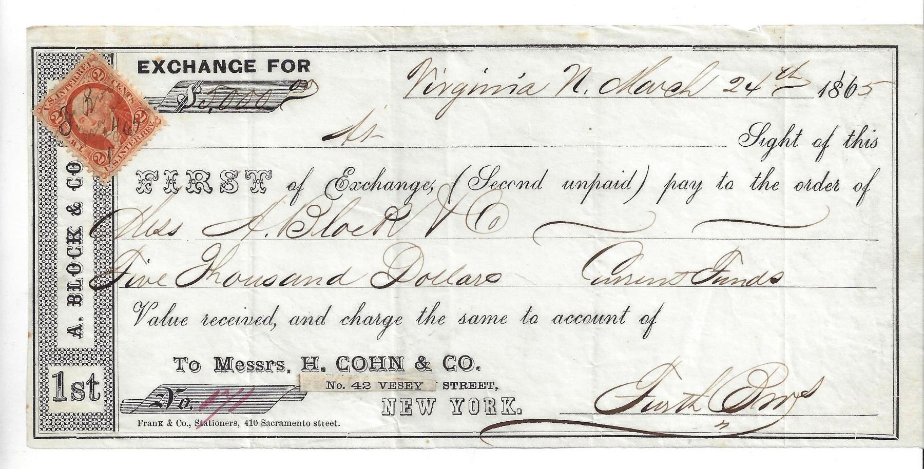 1865. Early period of Comstock. Nevada had only been a state for 5 months when this was done. $5,000 was a lot of money in those days - like $75,000 in today's world. Just what would a General Merchandise Company spend $75,000 on??? A Block and the Cohn name were synonymous with New York and Virginia City! The Furth brothers were found in the 1868/9 Nevada Directory as having a store in Genoa. Printed by Frank & Co. Stationers, 410 Sacramento St. 2 cent adhesive revenue stamp with pen cancel. Folds. 3.75" x 8.25". Biographies on Fred and Jacob Furth. State: Nevada City: Virginia, Storey Date: HWAC# 99393