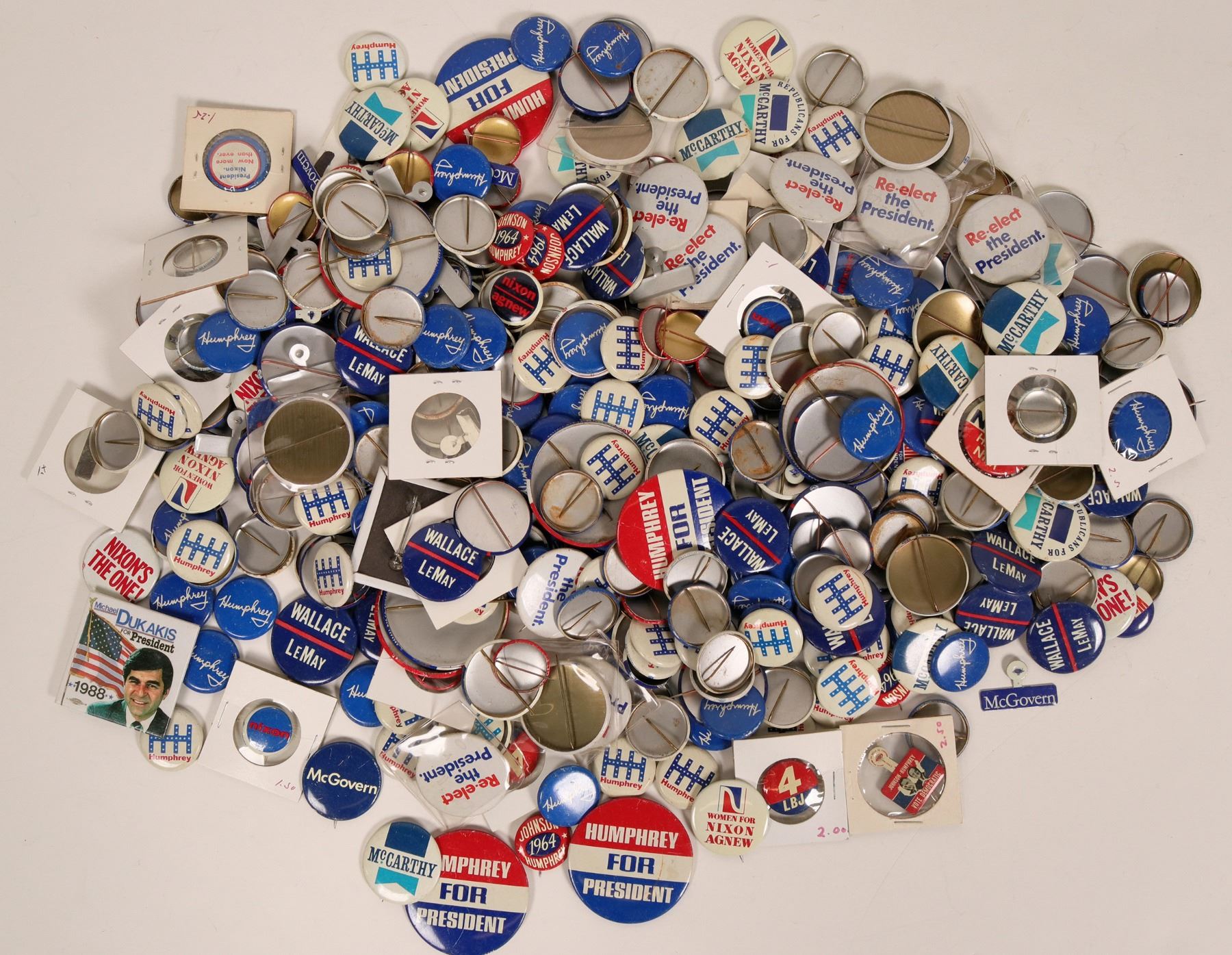 This is a box filled with campaign buttons from various campaigns over the past three or four decades. Candidates include Eugene McCarthy, Hubert Humphrey, Lyndon Johnson, Nixon, Dukakis and more. All are in good condition. See photos for more details.