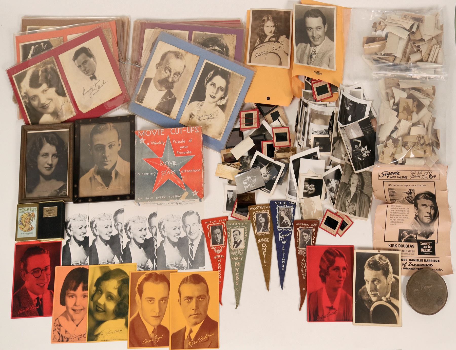 "MGM" used to advertise that it had "More stars than there are in the heavens." This lot comes pretty close to that. There are hundreds and hundreds of photos, star pennants, playing cards and even a Hollywood jigsaw puzzle. Looking through the collection, you'll see stars like Norma Shearer, Rudolph Valentino, Ronald Coleman and William Powell. Most of the photos have a signature but, whether they are authentic? Who knows? Definitely a collection for the Hollywood film buffs.