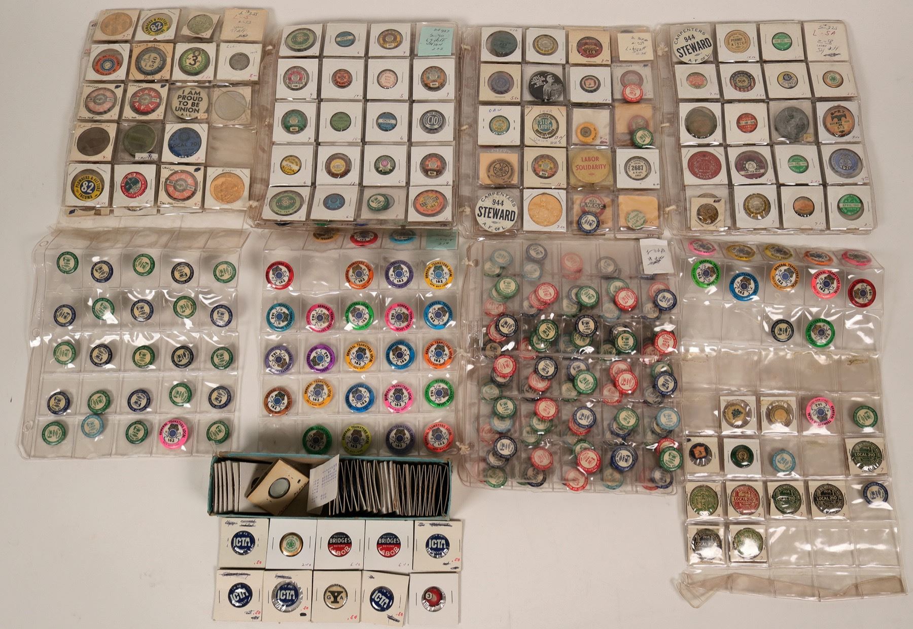 This is a large group of trade union buttons, pin backs and medallions that include unions like Plumbers & Fitters 82, UAWAFL, Wisconnsin Industrial Union and hundreds more. All in in good to almost new condition.