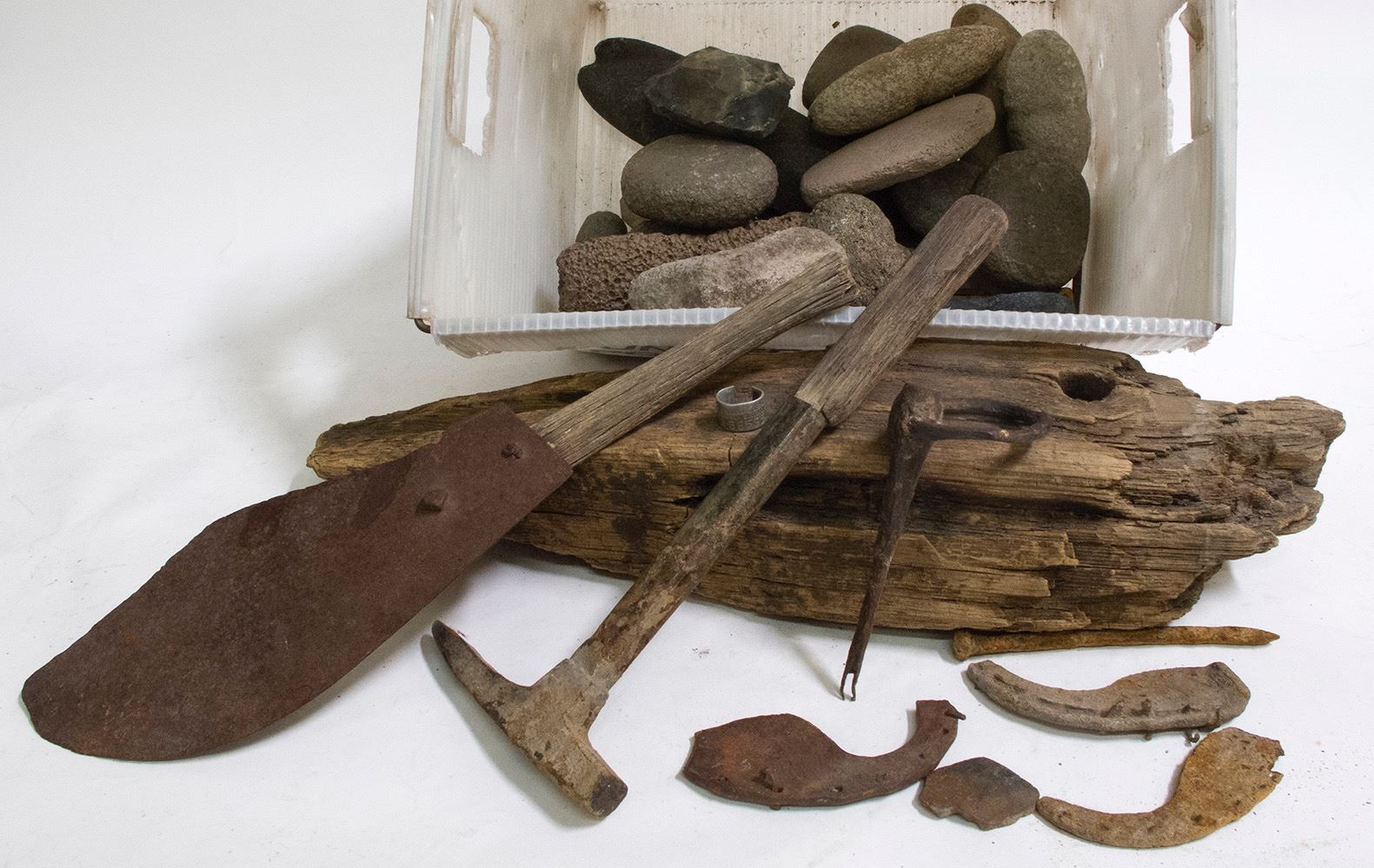 These items were all from the Clayton Phillips collection. It is a regular treasure trove. Some of the most interesting items include a homemade scythe (?), large piece of wood that looks like it came off of a wagon, miner's small hand pick, large and small oxen shoes, nine pestles of various shapes, sizes and colors, two fish & wildlife round tags, and four notched rocks that would have been tied to wood for use as a Native American tool. Phillips worked on the Pyramid Lake Indian Reservation for years and most of these were most likely collected around this region. HWAC# 45506 Date: Location: