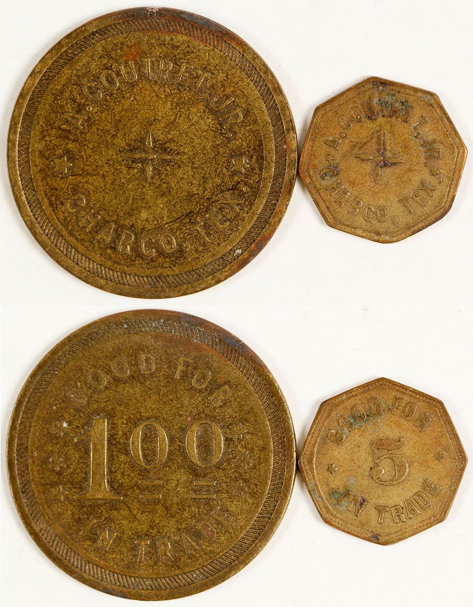 A. Coutret Jr. tokens GF 1.00 IT. B/R /35mm. Also GF 5 IT. Date: Location: Charco, Texas HWAC# 64115
