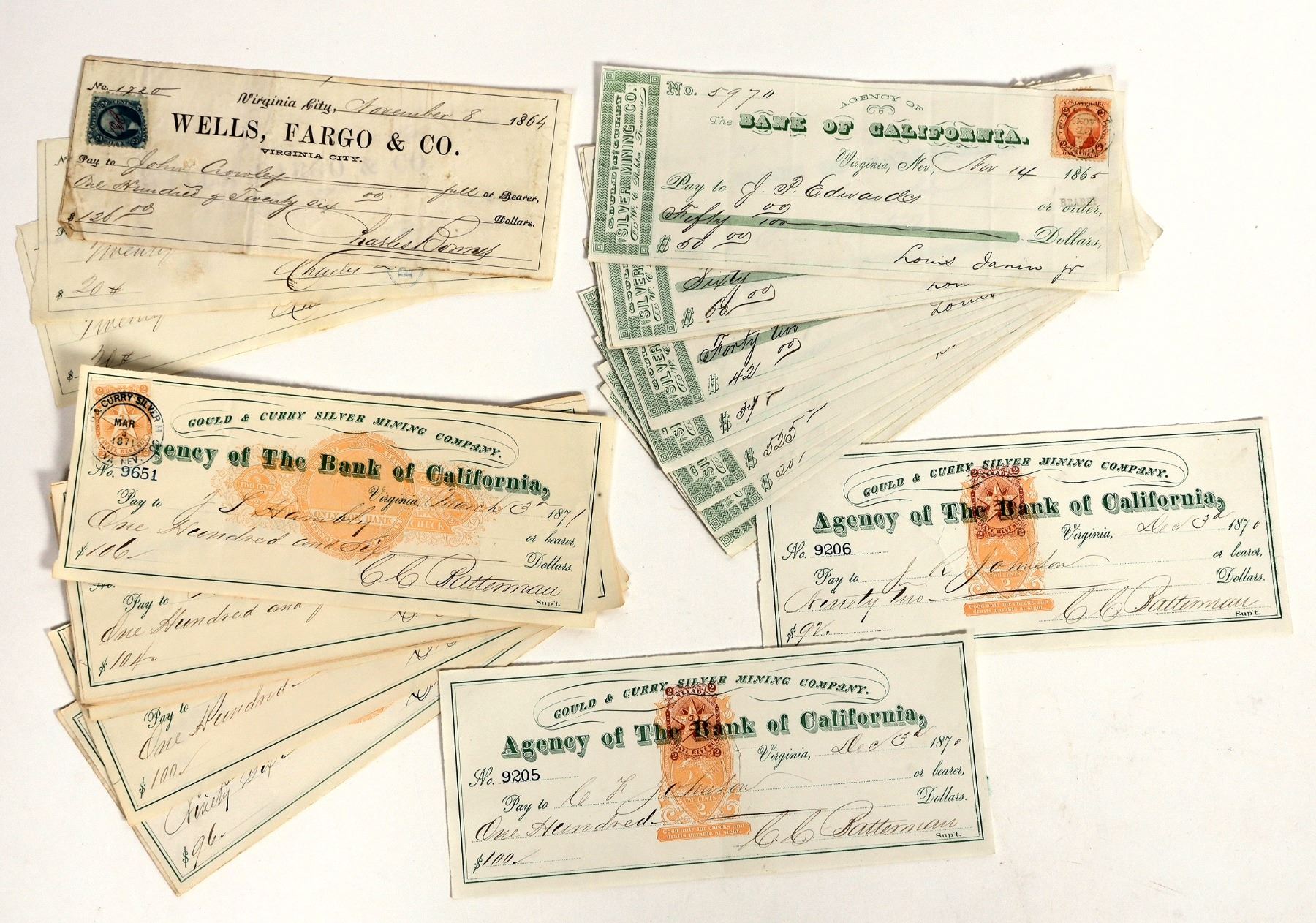 Lot of 27. This group spans the mine's history from just 2 years after the Comstock was founded, thru the G&C bonanza period in the early 1860s, to the mining depression in the late 1860s, and finally just before the Big Bonanza discovery in 1873. Includes: two very early 1861 Wells Fargo checks singed by Strong; 1864 Wells Fargo signed by Bonner; ten 1865 checks signed by Janin; two 1870 checks with very rare RN-B17b, signed by Batterman; two 1871 checks with very rare RN-C21b signed by Batterman; and ten 1871 checks with RN-C and orange NV adhesive stamps (tied cancels) signed by Batterman.