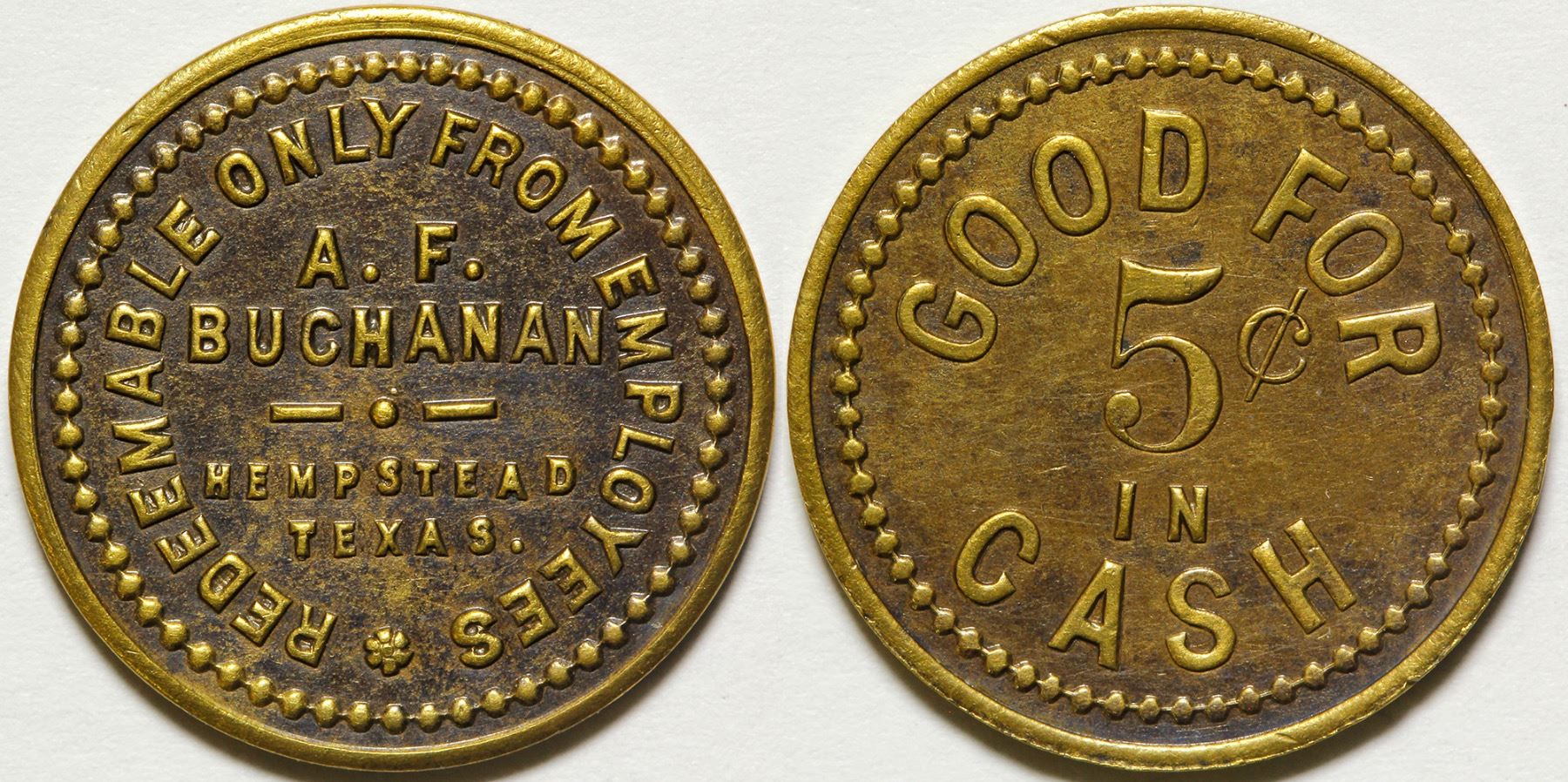 GF 5c in cash. Redeemable only from employees. Confederate Army post before Civil War. HWAC# 62601 Date: 1861 Location: Hempstead, Texas