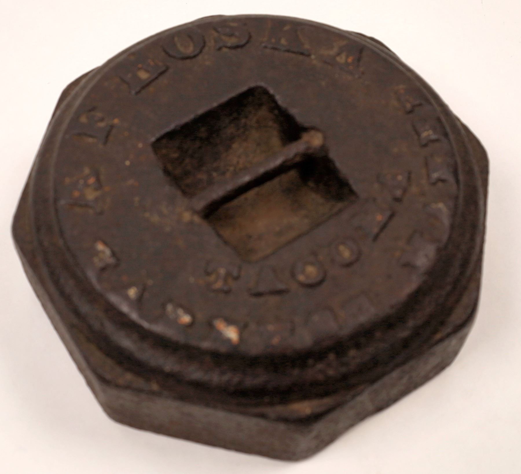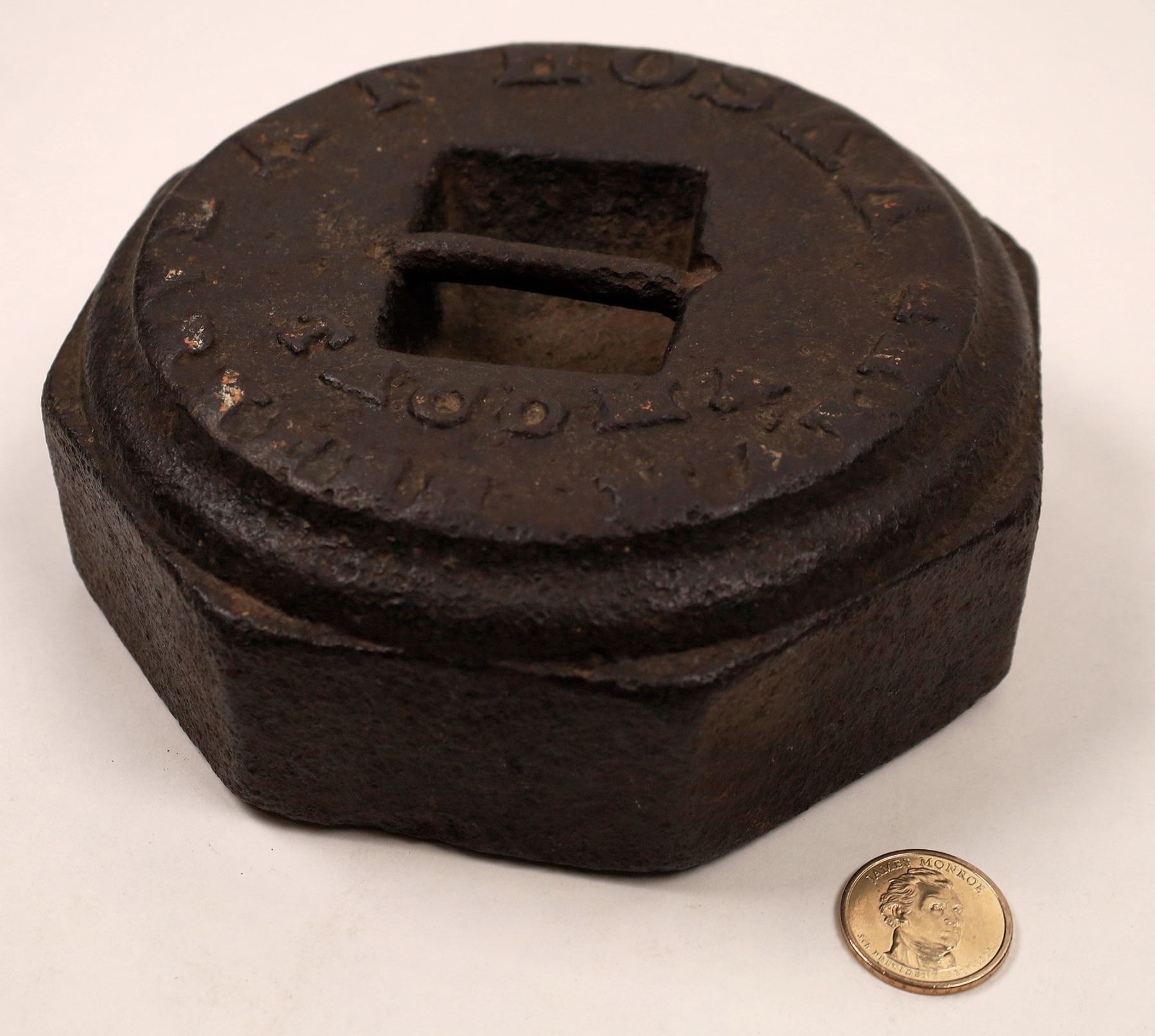 Unique 1880s horse tie for this well known harness and saddle maker in Tacoma. About 7"octagonal, 2" thick, about 15+ pounds! Embossed lettering on the top. Place to tie the horse rope or reigns in the top middle. Very Rare.