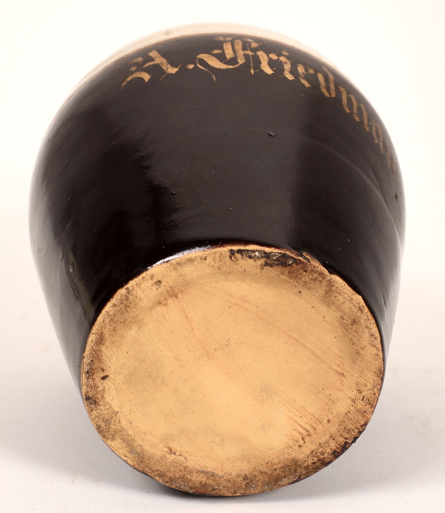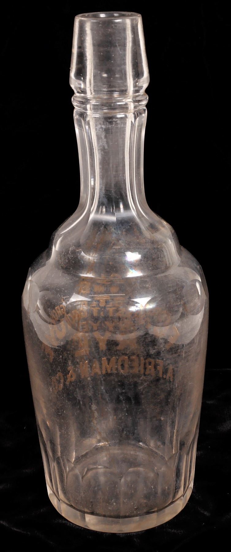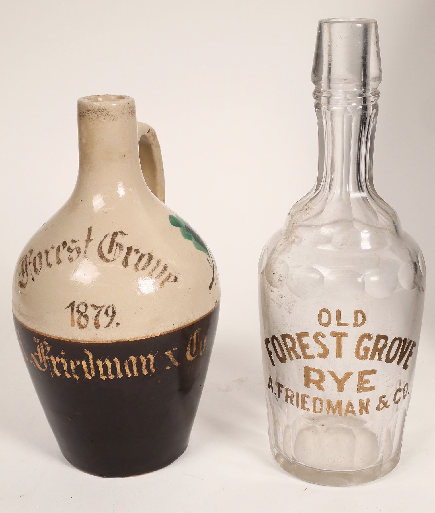 2 tone brown advertising jug, Forest Grove 1879, A Friedman with 2 side flower designs, c. 1879, rare J71, 8.5". Old Forest Grove Rye, A Friedman, gilded back bar bottle, also rare c. 1890. No apparent chips or cracks. Nice pair! Denver Colorado c. 1879 & 1890