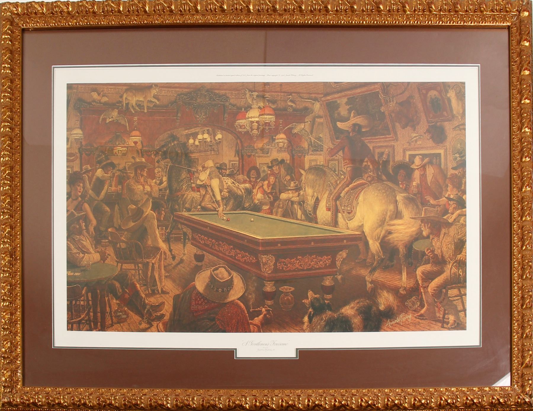 See the story under “Winners and Losers” for the story on Friberg. 21 x 35” image, in 31 x 45” gold frame. The foursome refers to two players at the billiard table playing on horseback in the saloon. 1349/1500. a classic!!