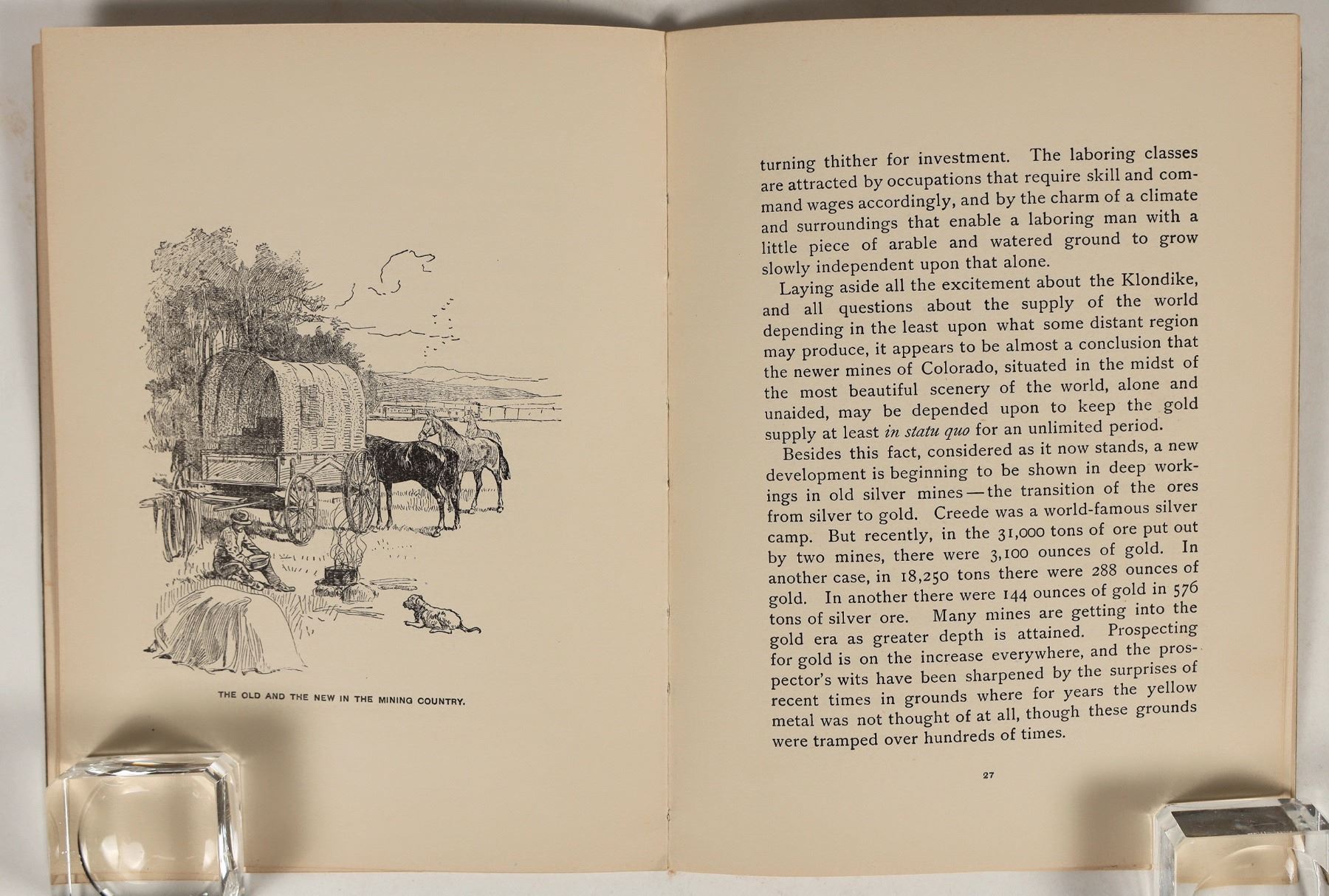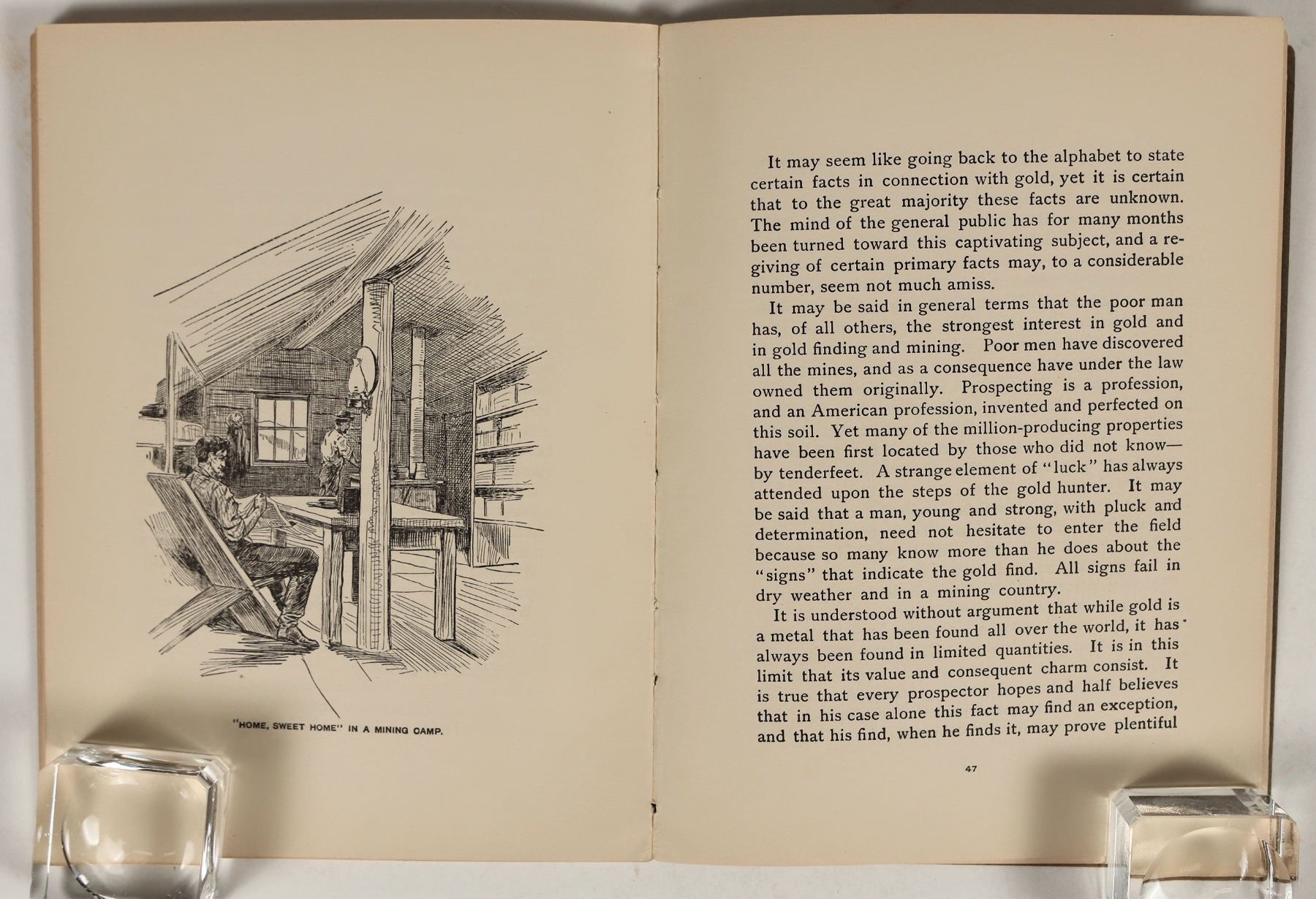 Fantastic and rare! "The Facts and Figures, With a Brief Description of Mines, Miners, and the Art of Gold-Finding." By Capt. James Steele. Published by The Passenger Department of the Chicago, Milwaukee & St. Paul Railway, December, 1897. Map showing the rail route from Chicago to San Francisco across the Western States, 6.5 x 22.5". 60pp. with a handful of illustrations. James W. Steele combines firsthand reports, mining statistics, and anecdotal material to promote the vast mineral wealth still to be extracted across the Western U.S. and Alaska. The book was clearly intended to attract investors, settlers, and prospectors, presenting the West as a land of renewed opportunity amid the Panic of 1893's economic aftermath. 7 x 5" Age discoloration to softcovers and pages. Overall a very nice copy.
