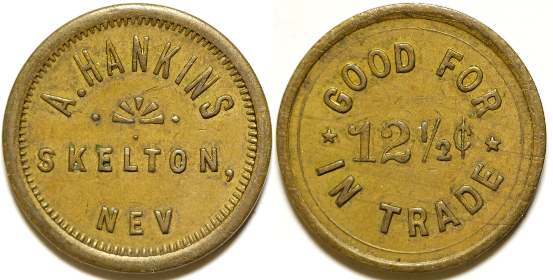 Obv.: A. Hankins / Skelton,/ Nev.; Rev.: Good For / 12 1/2c / In Trade. Br., rd., 22 mm. State: Nevada City: Skelton Date: HWAC# 84314