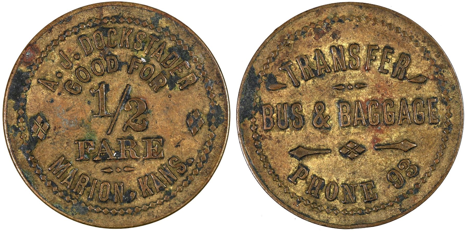 A.J. DOCKSTADER / GOOD FOR / Ω / FARE / MARION, KANS. // TRANSFER / BUS & BAGGAGE / PHONE 93 (tear-drop ornament each side of TRANSFER); Br., rd., 30 mm.