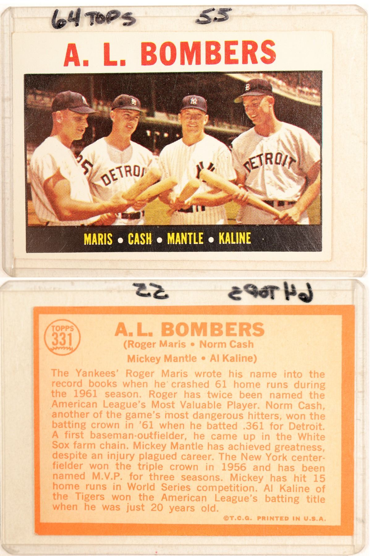 This is a 1964, TOPPS 331, A.L. Bombers (Roger Maris/Norm Cash/Mickey Mantle/Al Kaline) Baseball Card. Card has four players: Maris, Cash, Mantle, and Kaline on front. Reverse has small excerpt about about each player. Corners are worn. Edges have little wear. Not centered.