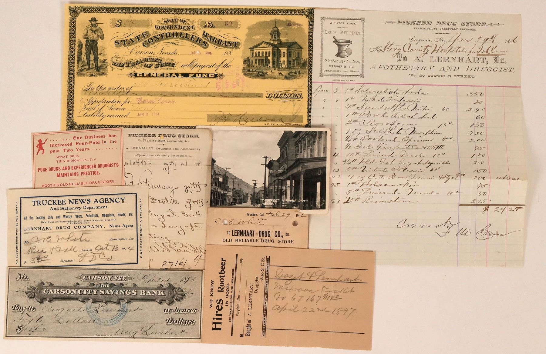 Lot of 9. Includes: 1) 1886 pictorial billhead, Pioneer Drug Store, Virginia City, to Storey County Hospital. 2) 1889 prescription slip, Pioneer Drug Store, Virginia City. 3) 1883 Carson City Savings Bank check issued to himself. 4) Small 1890s receipt for the Virginia City store, advertising Hires Rootbeer. 5) 1884 State Controller's Warrant issued to and signed by Lernhart.6) RPPC of Virginia City, mailed 1949. 7) Three pieces for his Truckee business: Truckee News Agency subscription form, 1914, Lernhart Drug Co. as News Agent; partial 1912 receipt for the Lernhart Drug Co.; label for Booth's Old Reliable Drug Store. Lernhart started his VC drug career working with W. Biter in 1877. He bought out Biter and it became the Pioneer Drug Store. In 1881, he bought BF Foster's drug store in Carson City. He sold the VC store in 1907 and took up business in Truckee. For more info, see Volume Two of the Nevada Bottle Book.