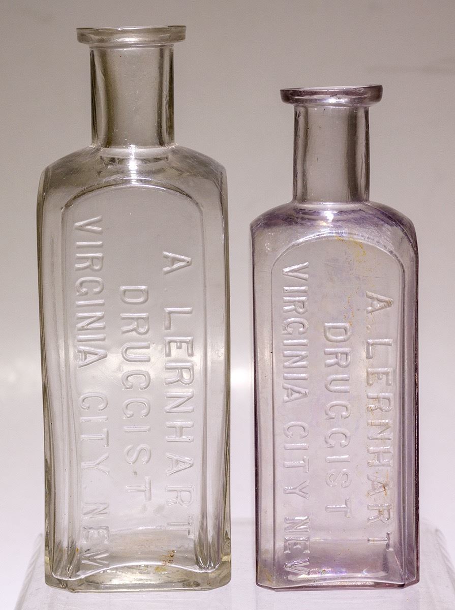 A. LERNHART / DRUGGIST / VIRGINIA CITY. NEV. Clear 5" rectangle, clear 5.75" rectangle. Page 186 in Holabird. No visible chips or cracks. Date: Location: Virginia City, Nevada HWAC# 57930