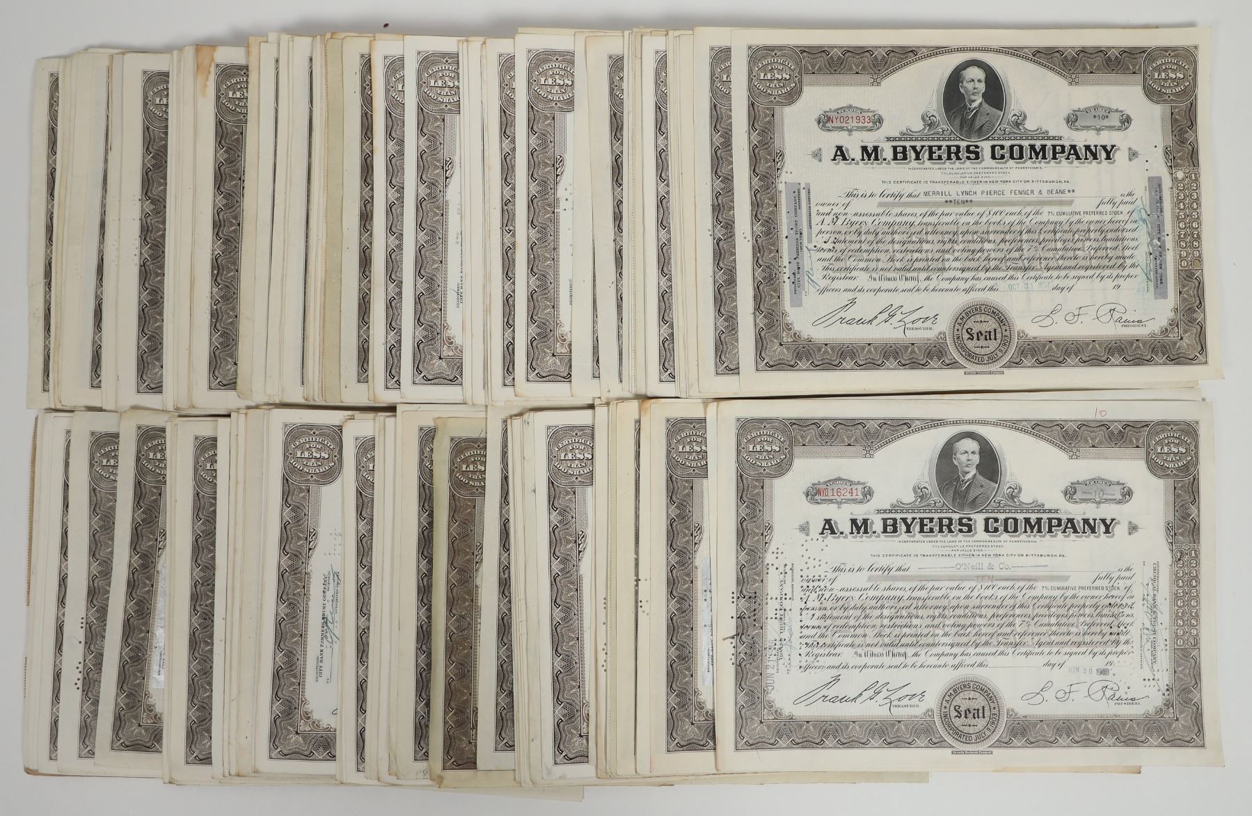 Group of approx. 225 stock certificates for less than 100 shares from the A.M. Byers Company, a Pittsburgh-based wrought iron manufacturing company, issued from 1937 to 1958. All issued, all cancelled w/ hole punched cancellation. Dark brown ink, vignette of company founder Byers on each. 12"x8.5" certificates. Certificates vary in condition with some foxing, soiling; see photos.