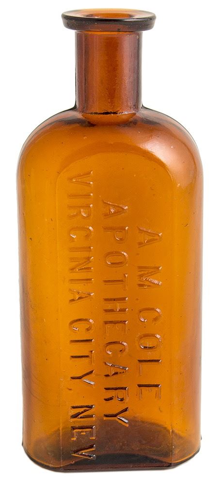 Amber A. M. Cole Drugstore bottle from Virginia City. Near mint. There are less than 10 amber Coles known today. Nevada only has two Amber drugstore bottles, this one and the Amber Thaxter bottle from Carson City. See Holabird volume 2, pp 85-108. The amber Cole dates from approximately 1878-1880. X-Holabird. City: Virginia City State: Nevada Inventory Number: 39520