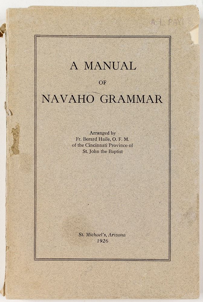 A Manual of Navaho Grammar. arranged by Fr. Berard hailed, O.F.M. of the Cincinnati Province of St. John the Baptist. St. Michael's, Arizona, 1926. Soft cover, tan, loose from binding. City: State: Native American Date: Inventory# 39906