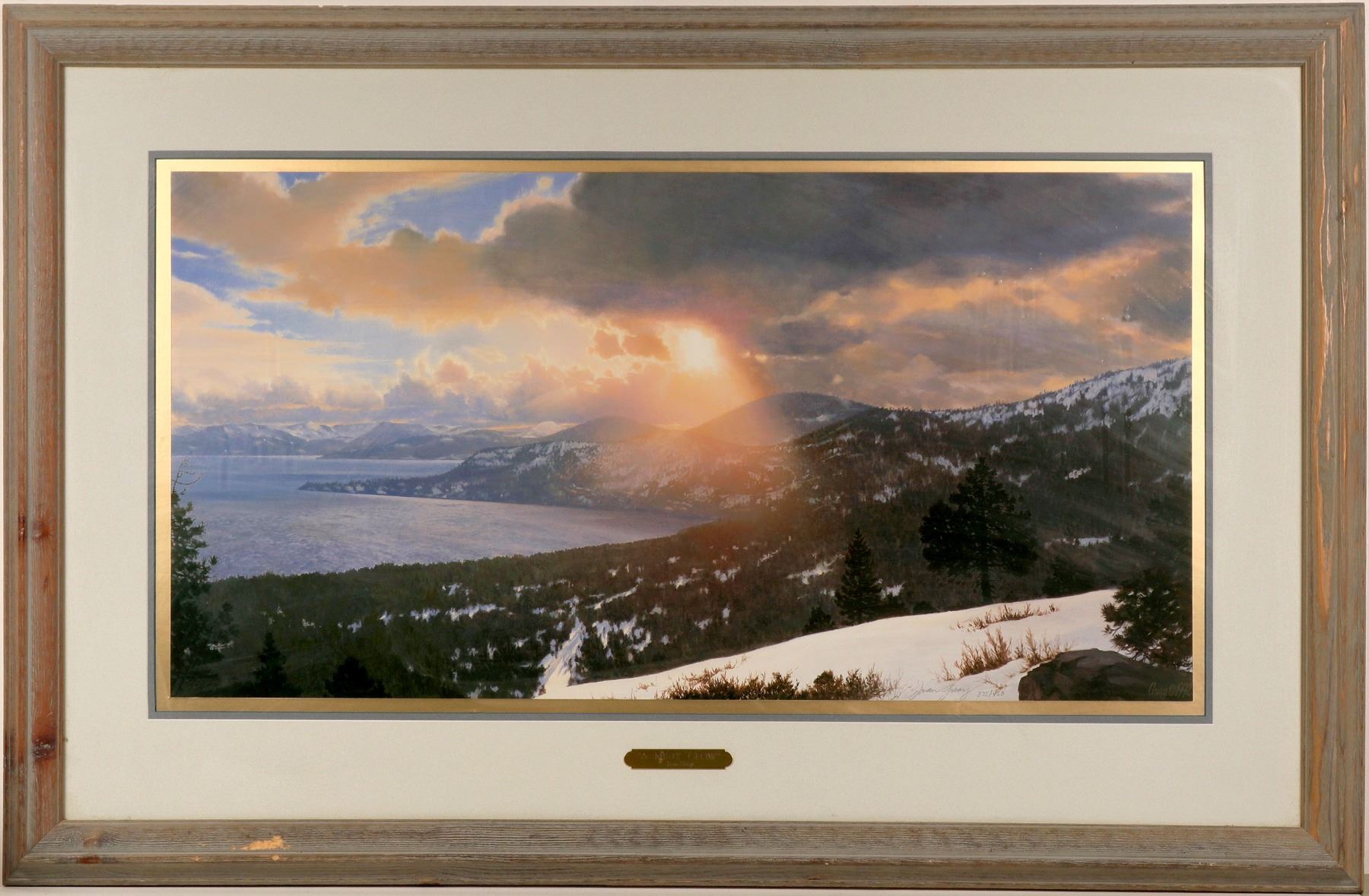 "A Misty Glow"--Lake Tahoe--375/450, from a series of 450 signed and numbered print by Jean Guay. Beautiful lithograph published from artist original oil painting.Approx. 17" x 34", framed and matted 28" x 43.5". Jean Guay has always loved the mountains. "Discovering the High Sierra was a grand surprise for me," states Guay, "I have hiked over 6,000 miles on its many trails taking me over 150 passes, I have probably spent more time and must have been more places in the High Sierra than any other artist past or present."