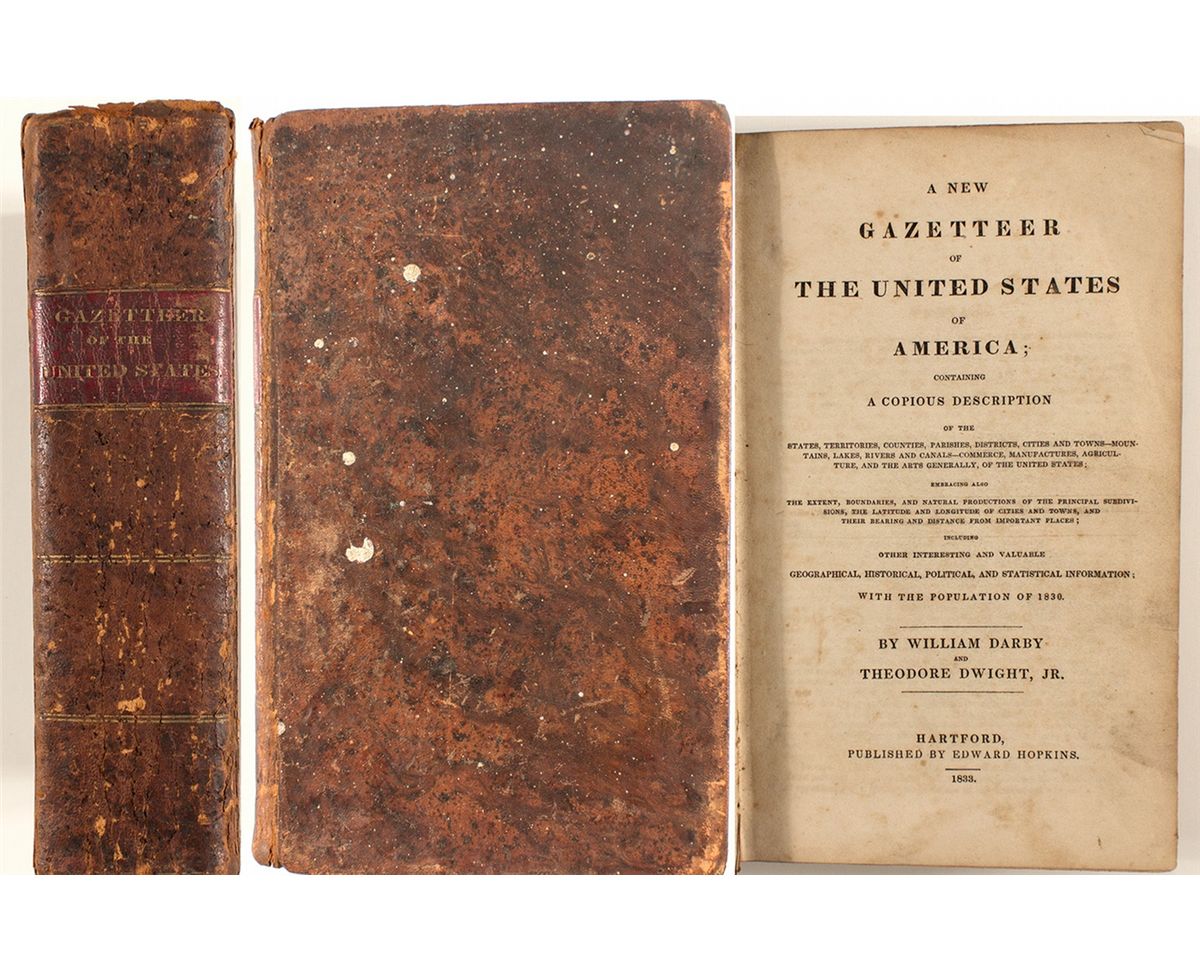 Darby & Dwight; A New Gazetteer of the United States of America...; 1833; Hopkins, Hartford. 630pp with appendix. Red brown leather boards, as original. approximately 5 x 9". spine wear. All original. Prepared in 1832, this two column work is an alphabetical listing of all geographic terms found in America. It includes 1830 census data. Important early work on place names and locations.City: County: State: Date: 1833