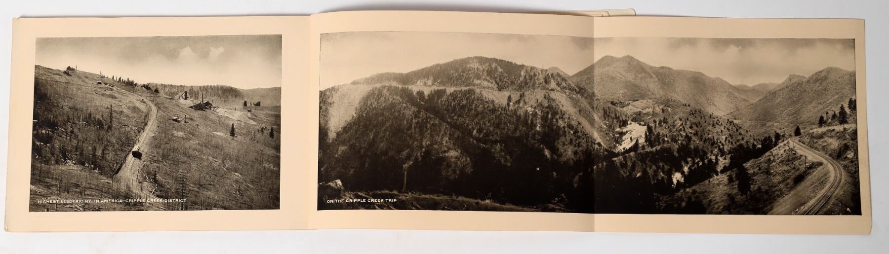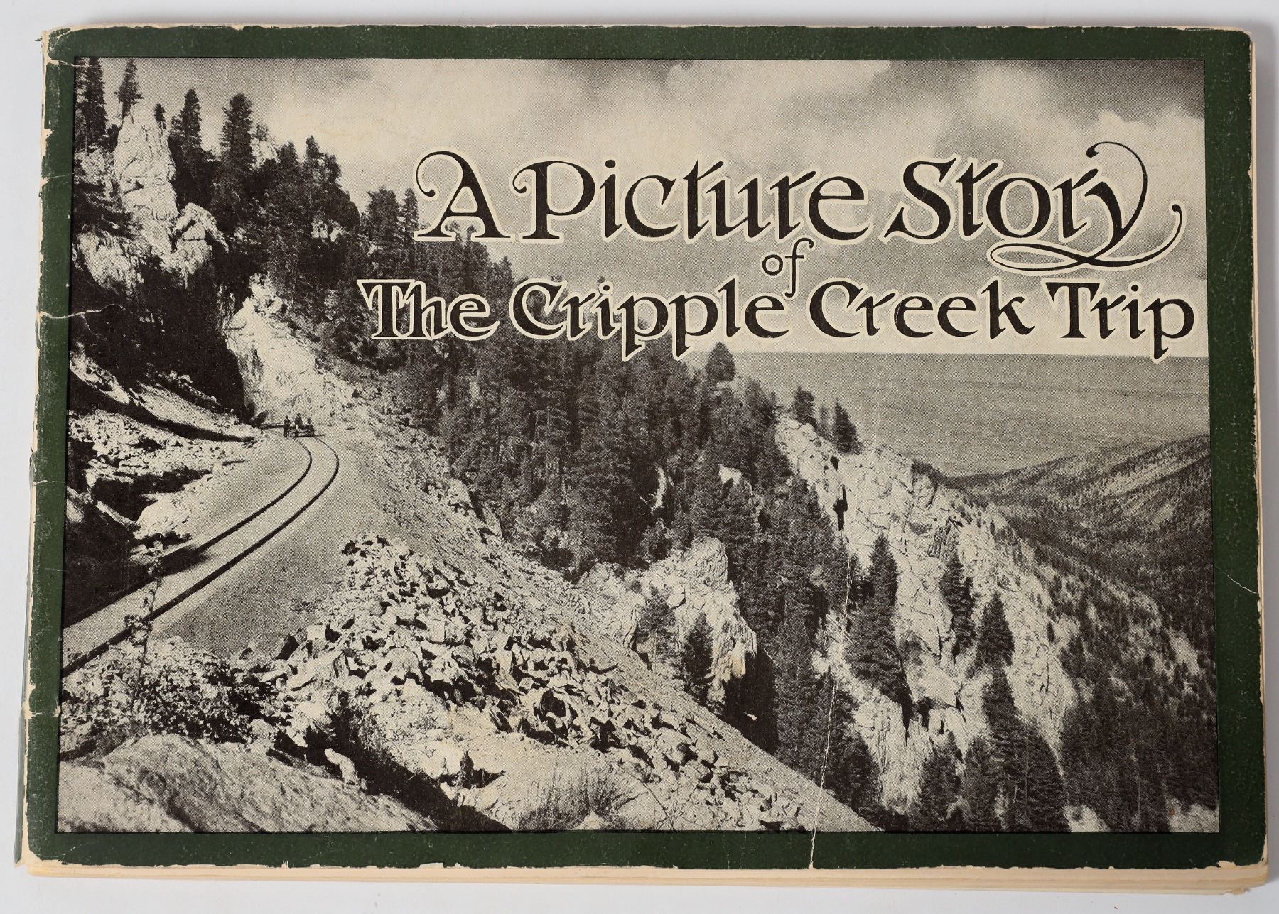 Book titled, "A Picture Story of the Cripple Creek Trip." Probably from the late 1800s or early 1900s. This is a book of photographs taken on a trip on the Cripple Creek Short Line. Includes a short history of the railroad line on the front page. Also includes a short history of the Cripple Creek District on the last page. All other pages are photographs, including some large panoramas that fold out. 8.5 x 6 inches. Good condition.