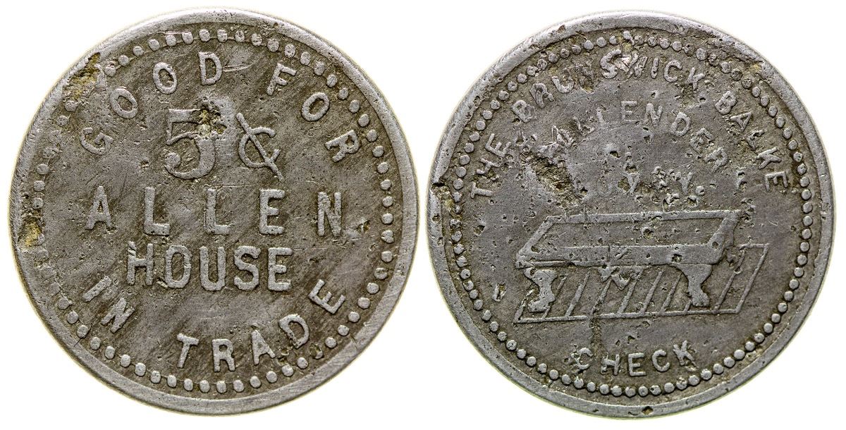 Extremely rare. A. Rickart, Proprietor. The Brunswick Balke / Collender / Check // GF / 5c / Allen / House / It. Round, aluminum, 24mm. (Svoboda Collection) City: Thompson Falls State: Montana Date: 1894 HWAC# 35857