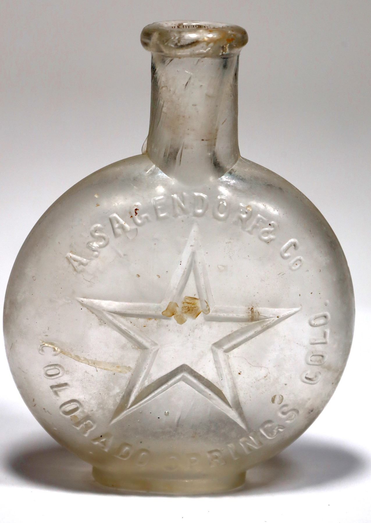 Preble W-13. A. Sagendorf & Co. / (Star) / Colorado Springs, Colo. // (Clock pictorial with "No Tick" on the face). Clear glass, 4.5", wiped top. One of two varieties of this unique clock bottle. Crack to the left of the star, lots of haziness. Please inspect. According to 1880s newspaper ads, A. Sagendorf and Geo. S. Robbins operated a drug store in Colorado Springs.
