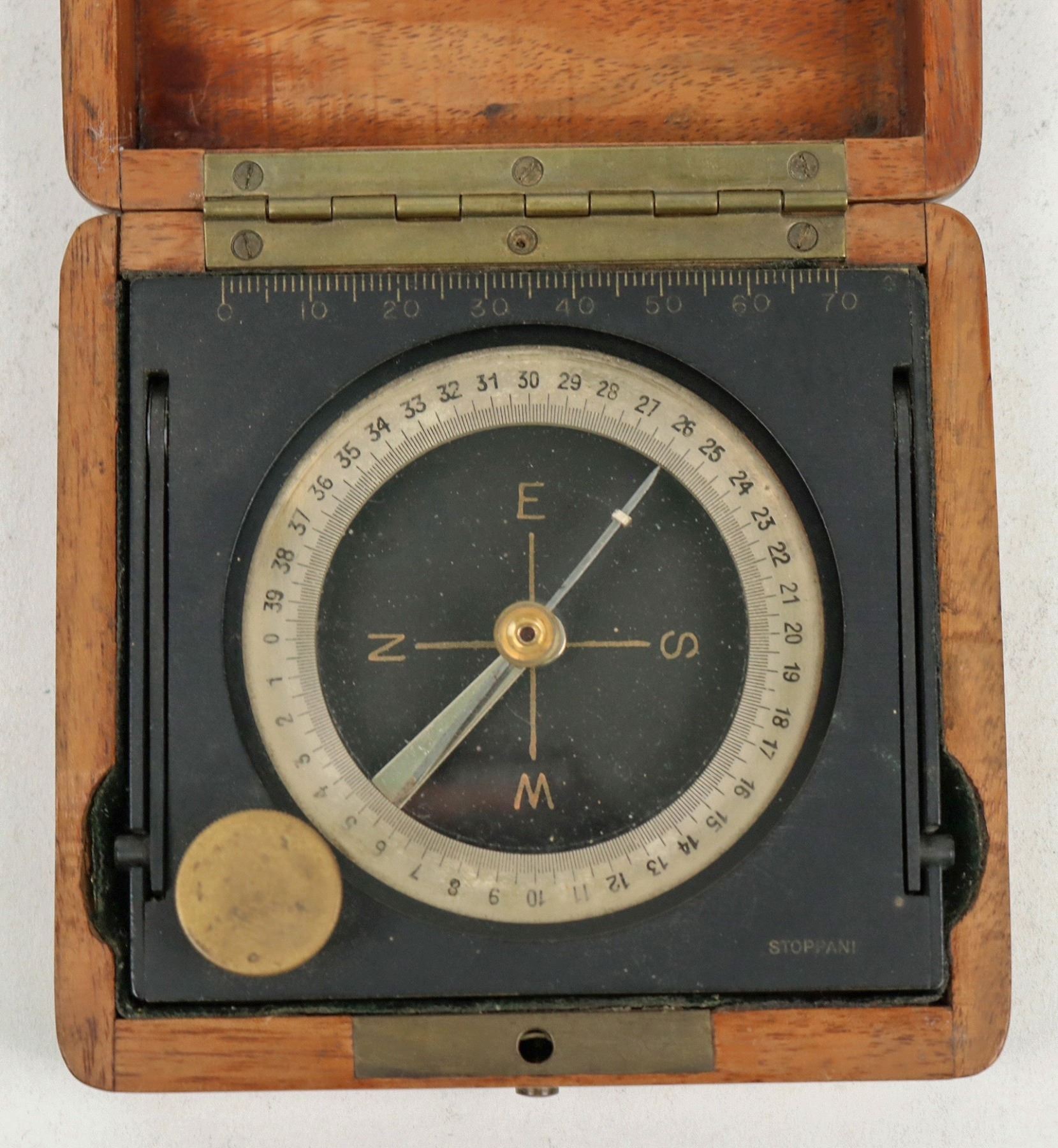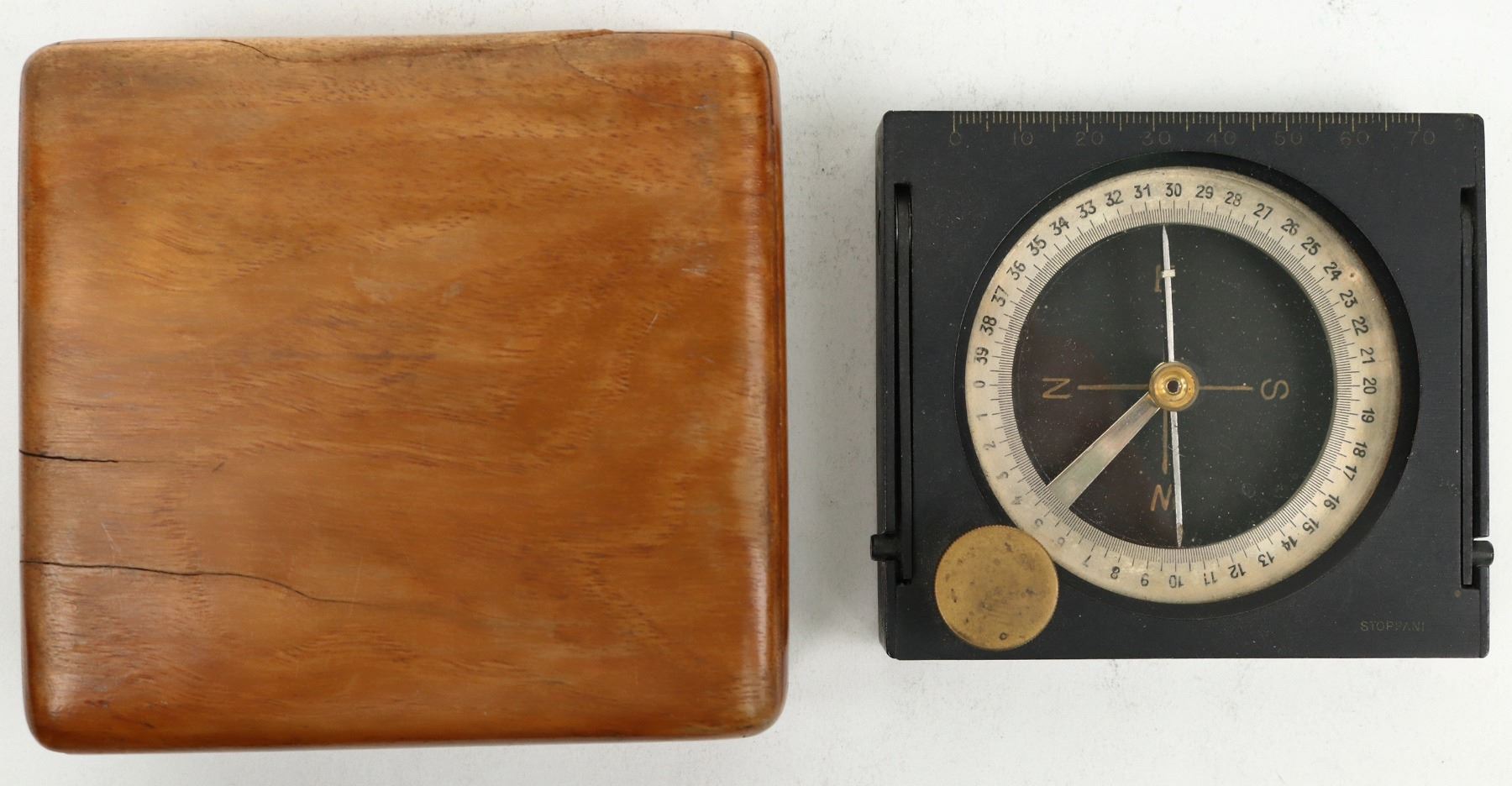 This is an A. Stoppani surveyor's compass with teak wood case. It works beautifully and all sighting arms are intact. 3.5 in. X 3.5 in. Please see photo for details.