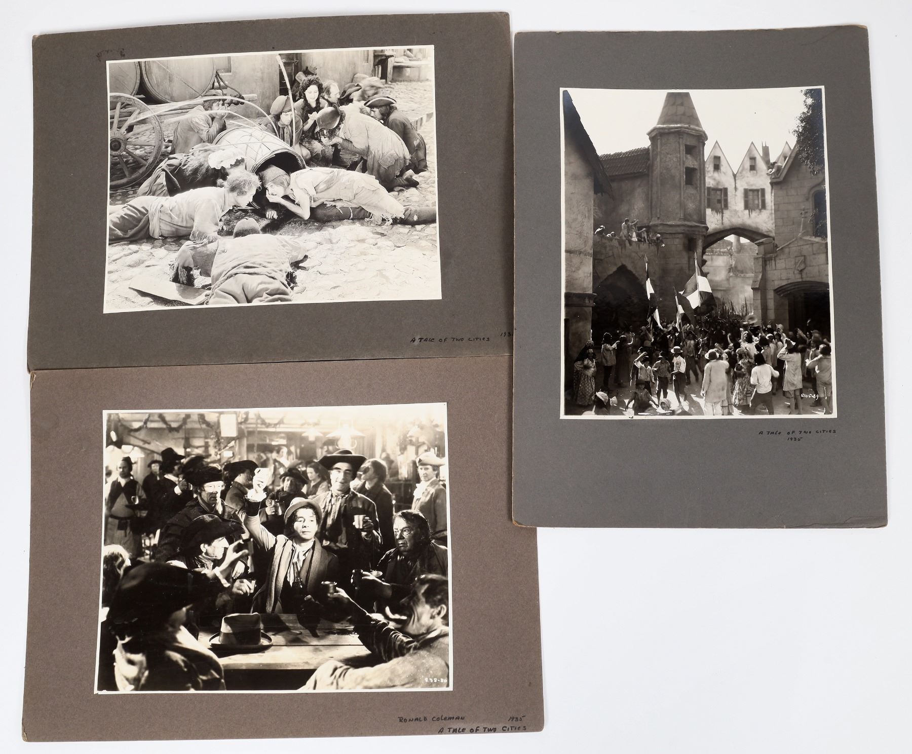 Three photographs from the 1935 movie, A Tale of Two Cities, based on the Charles Dickens novel. The film starred Ronald Coleman and Elizabeth Allan. All three photographs are mounted, overall size of each in 10 x 14 inches. Good condition. California Hollywood