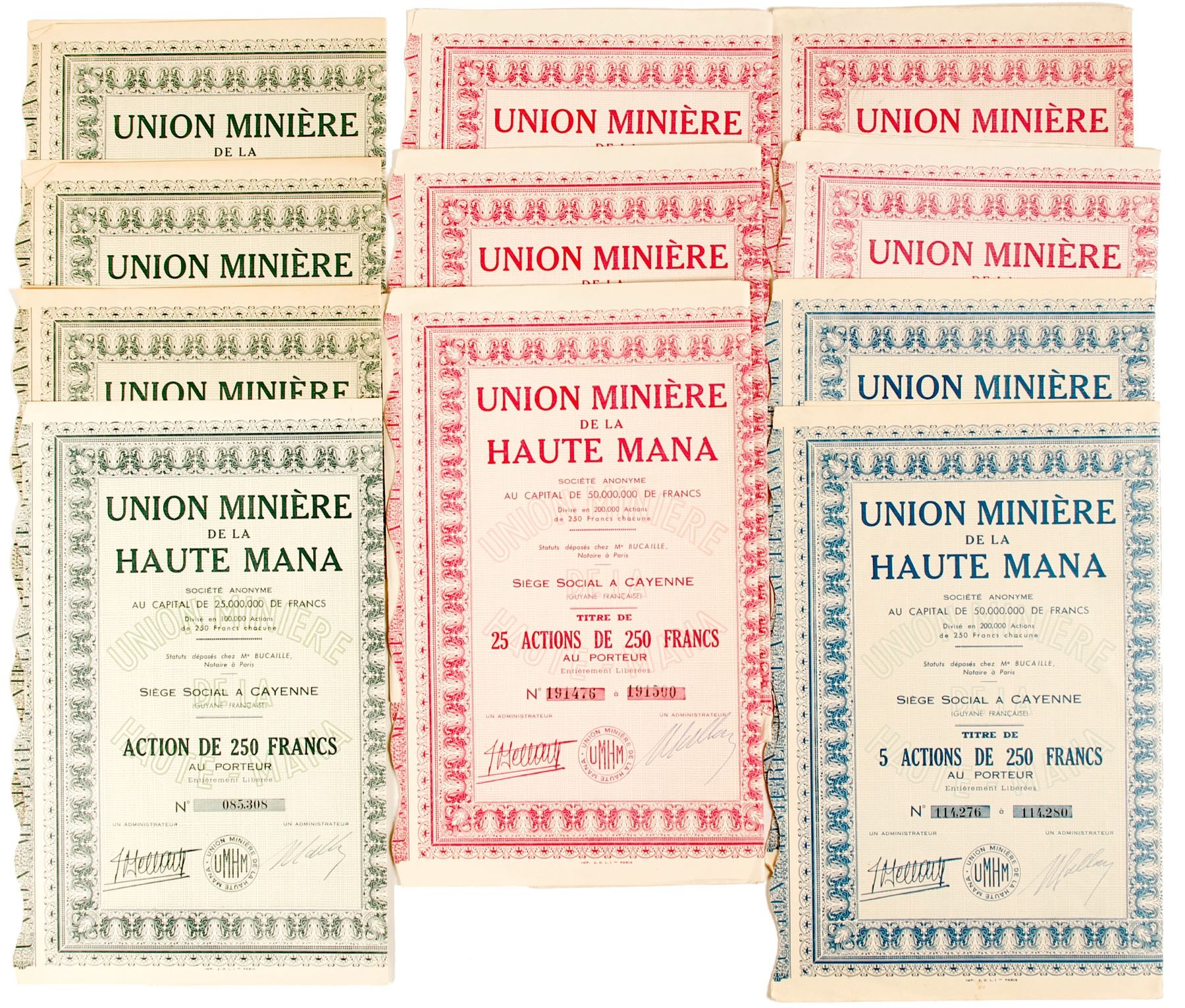 11 total certificates. All signed and unissued Bond certificates; the administrators signatures are illegible (stamp signatures). Very bright colors on all, very good condition; some discoloration around the edges; from Paris (?). City: State: Date: HWAC# 81075