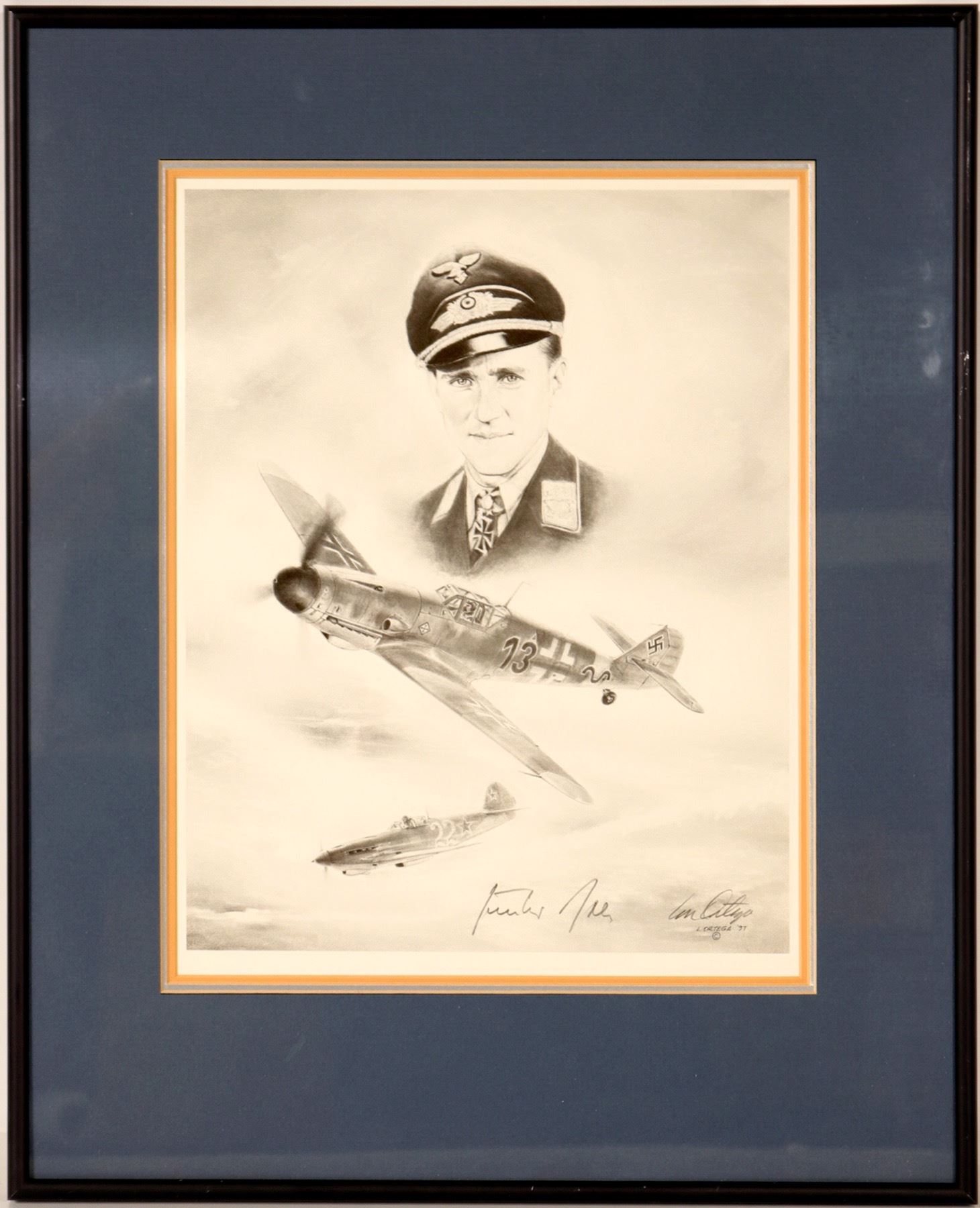 This is a sketch of Major Gunther Rall by artist Lonnie Ortega. The print is double matted with combat two aircraft. City: State: Date: