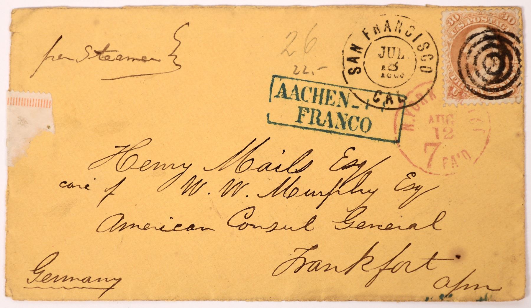 A30 in light brown on cover from San Francisco to New York and finally Frankfort Germany. 7 cents paid cancel. Front of cover only, white paper partially adhered to both sides. Please inspect.