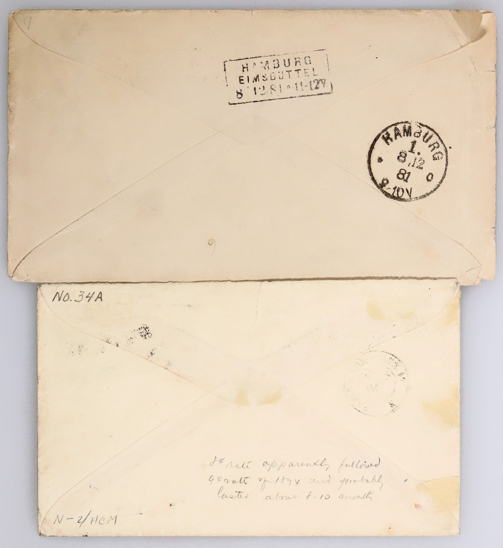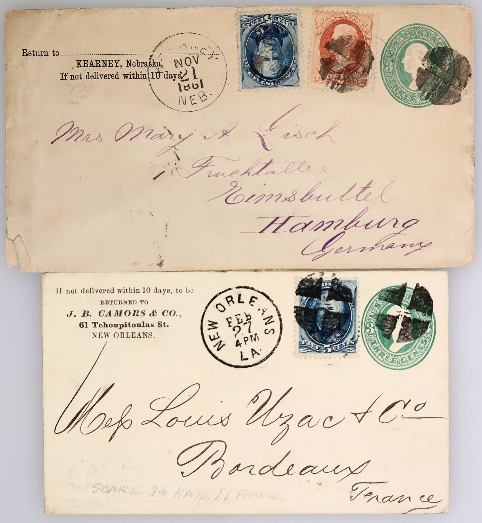 2 A55 covers to Europe. New Orleans to Bordeaux France on 3 cent green postal stationery, illegible cancel on back-2 staple holes, pencil writing on both sides. Nebraska to Hamburg Germany 1881 with blue 5 cent, rust 2 cent and green 3 cent postal stationery. 2 Hamburg cancels on back.