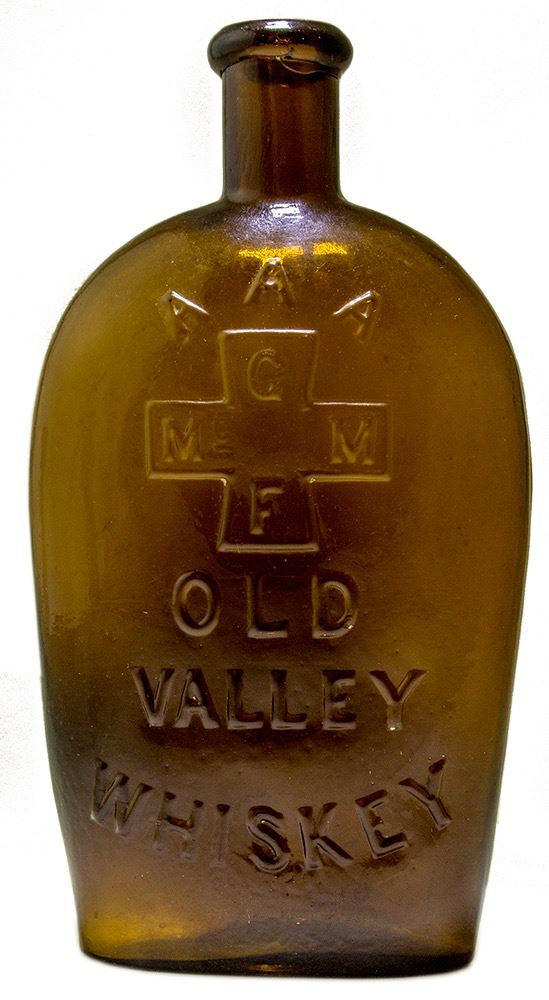 AAA Old Valley Whiskey, "G-Mc-M-F" in cross. Classic single roll applied top whiskey flask in medium amber with medium whittle. Bottle appears mint with no scratches or dings, but should be inspected. This particular specimen has been in the northern Nevada bottle rumor circle for more than a decade. During construction in south Reno near Winco Foods, construction workers found a small cache of bottles from the 1870's, and this was the highlight of the find. We had heard about it, but never seen the bottle until it was brought to our office. Early 20th Century maps seems to place this find near a corral at the Brown Ranch. City: San Francisco State: California Inventory Number: 38905