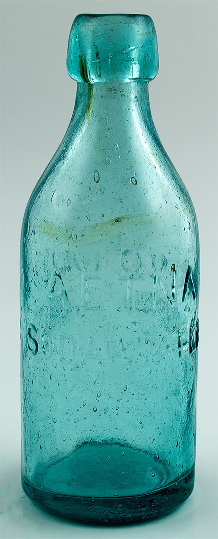 Aetna / Soda Water // Natural / Mineral Water //Pale aqua, blob top soda. 7 1/8" tall. applied top. Clean and shiny, with really nice texture to the glass. All kinds of small bubbles, scattered throughout the body of the bottle. But, there is a very unusual , in manufactured area on the base, but it is NOT DAMAGE. !! When the glass blower was blowing this specimen, he did not clean out the mold properly. There was an extra piece of glass , stuck in the mold at the base. So, when he blew this specimen, he blew it over that extra piece of rough glass. Otherwise, good quality, and a very nice crude specimen. ( RH ). State: California City: San Francisco Date: 1886-1905 HWAC# 29062