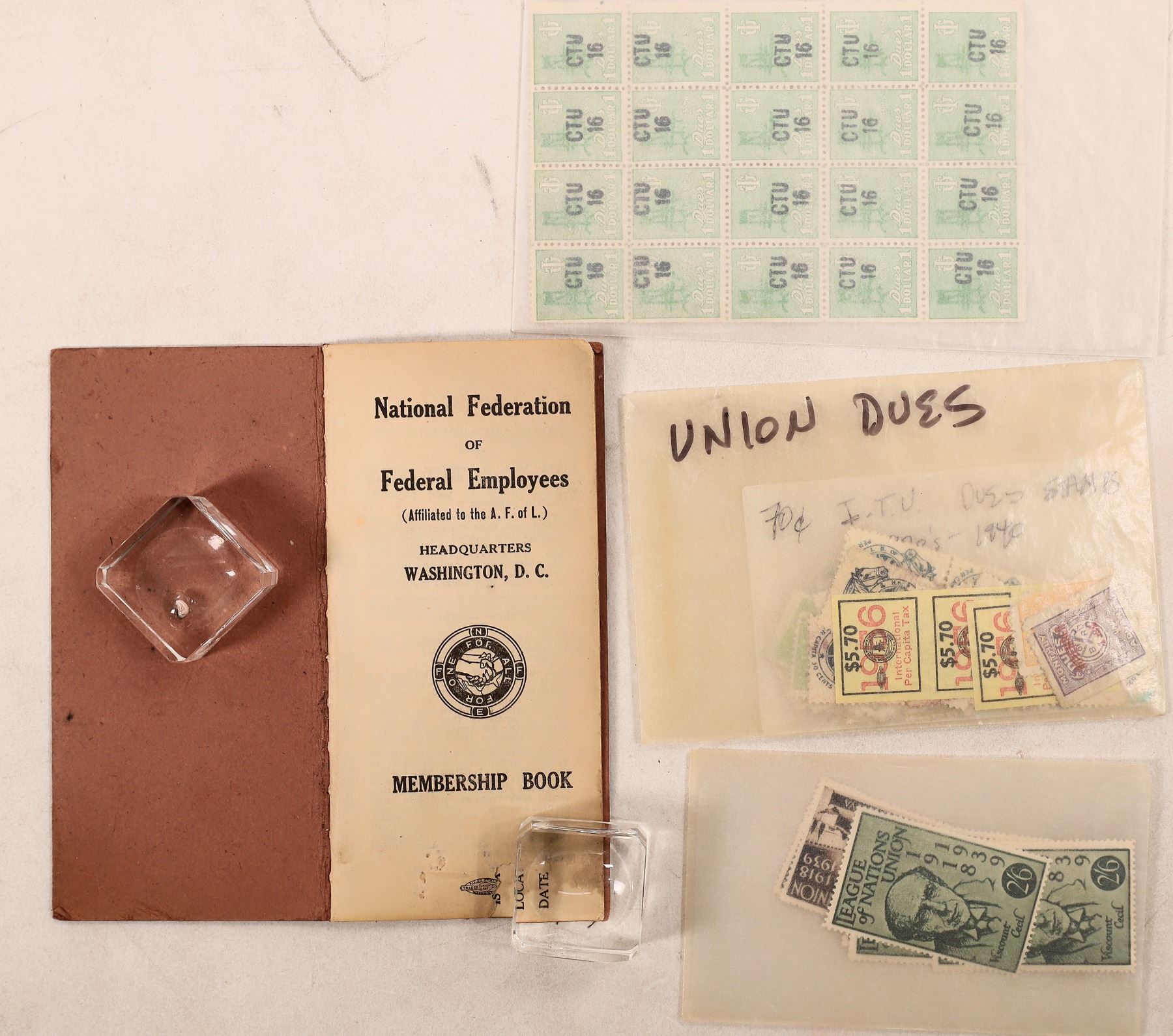 Booklet of union dues, stamps and labels from the National Federation of Federal Employees. Booklet is 2 1/2 x 5 1/2 inches and has three stamp envelopes with unused stamps. American labor history.