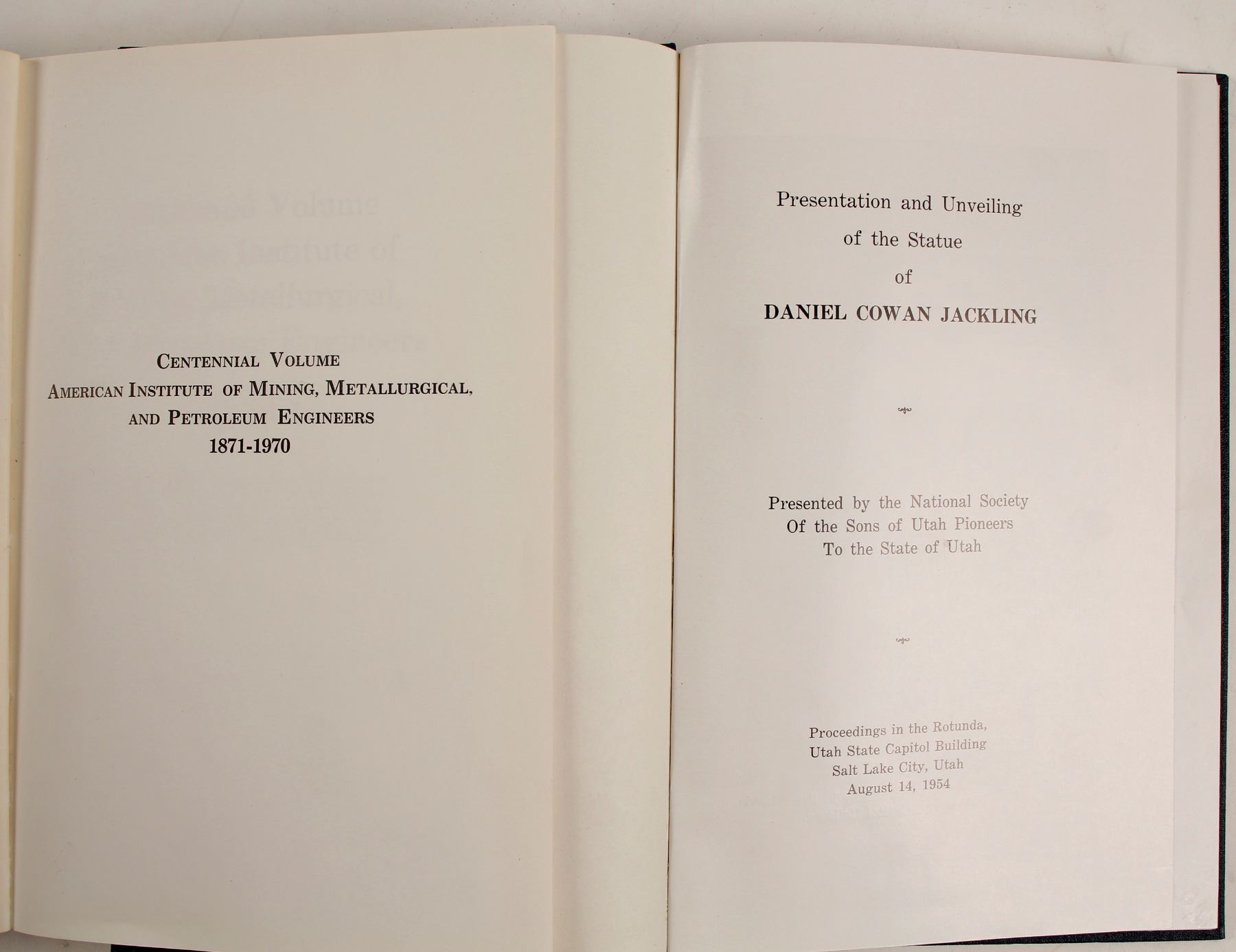 Hardcovers. Statue of Daniel Cowan Jackling presented in the rotunda of SLC, UT 80pp. AIME 1871-1971 centennial volume 366pp. State: USA City: Date: