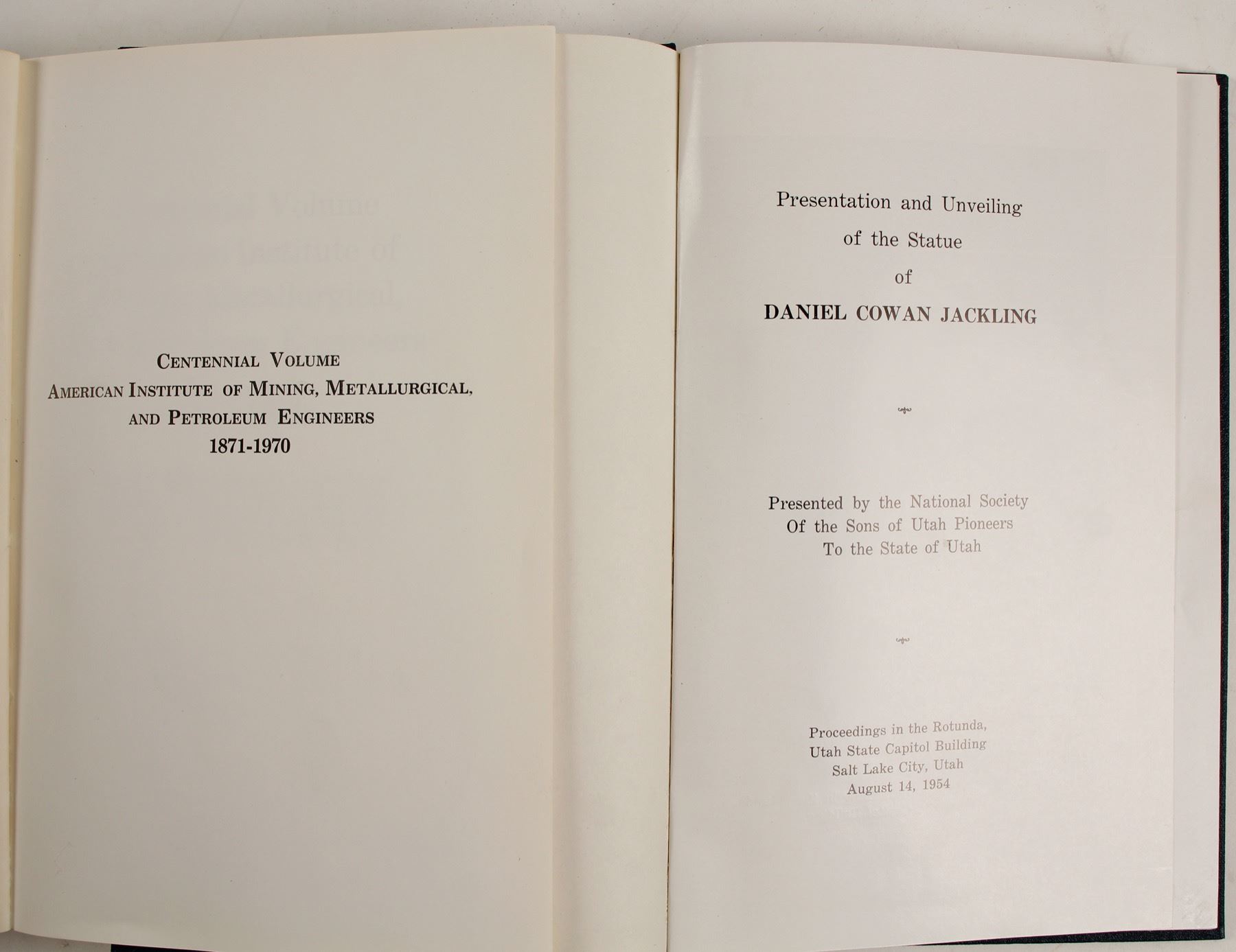 Hardcovers. Statue of Daniel Cowan Jackling presented in the rotunda of SLC, UT 80pp. AIME 1871-1971 centennial volume 366pp.