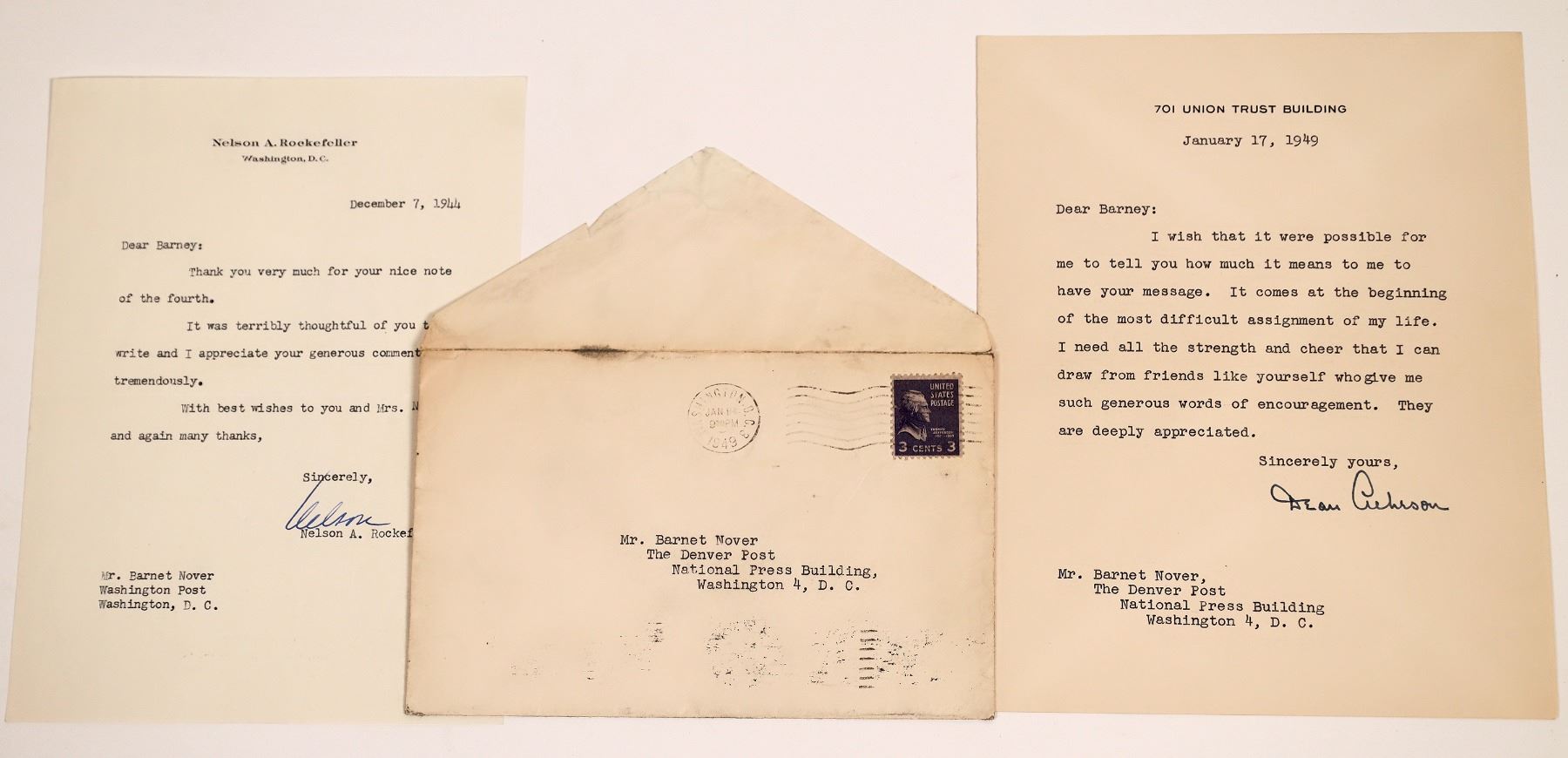 Lot of 2 ALS (Autographed Letters Signed). (1) Dean Acheson signed letter to Barnet "Barney" Nover/journalist thanking Nover for his words of encouragement in recent correspondence. Dated January 17, 1949 -- just four days before Acheson took office as the 51st US Secretary of State. With envelope postmarked January 18, 1949. (2) Nelson Rockefeller signed letter ("Nelson"), again to Barnet Nover/Washington Post thanking Nover for his "nice note." Dated December 7, 1944 at a time when Rockefeller was Coordinator of Inter-American Affairs of the US State Department which promoted relations with Latin America. Upon returning from the IAA Congress in Mexico City in December 1944 he convinced his father, John D. Rockefeller Jr, to donate to New York City family owned land which eventually became home to the United Nations Headquarters (text from Wikipedia)..