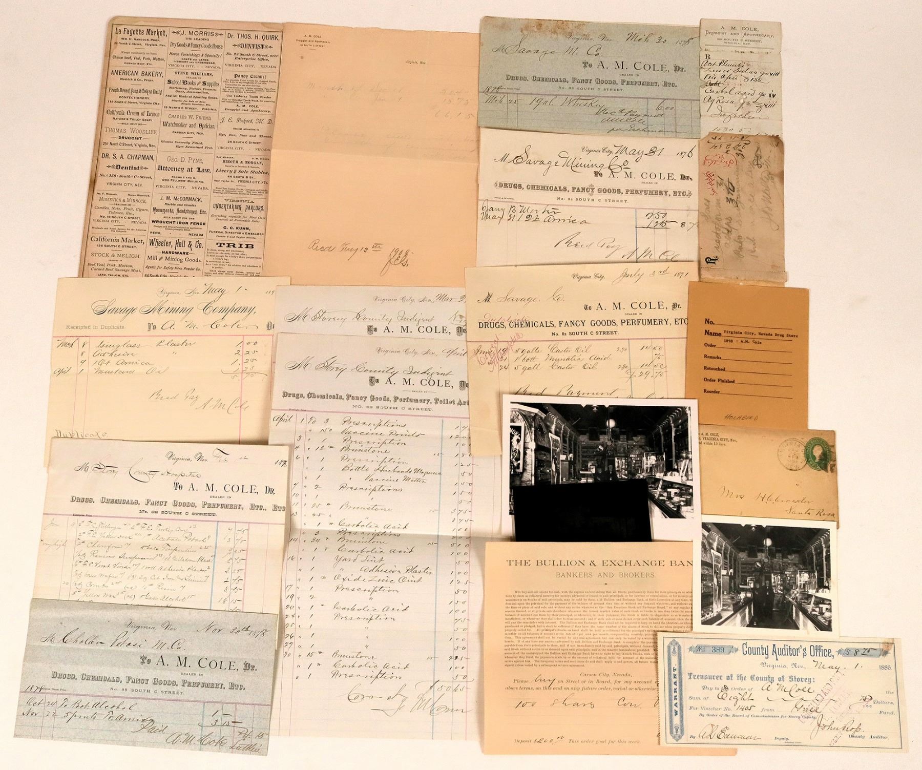 Lot of 17. 1) Nine billheads, 7 varieties. Most billed to Savage MC. Includes: 1871; 1876 (Crocker & Co. Print); two 1878 blue/green (Enterprise Steam Print); 1880 (Enterprise Print); two from 1888 (Footlight Print); 1893 Savage Mining Co. voucher; and 1909 letterhead. 2) 1891 corner ad. cover, no contents. 3) 1882 and 1898 prescription slips. 4) Carboard arithmetic card, c.1897, featuring ads for VC businesses including Cole's Pansy Cream.5) Other ephemera: 1899 stock buy order for Con Va, signed by Cole; 1886 Storey County warrant to Cole; and a negative with two prints showing the interior of Cole's store. Cole is perhaps the most well-known of all the Comstock druggists. He operated on the Comstock for nearly 50 years. His drug store is the longest running drug store in Nevada. After coming to California during the Gold Rush, Cole made it to the Comstock in the beginning of the rush in 1860. After investing in various mining properties, he started working for FJ Schneider and then Warner & Muncton. He purchased the latter's store in 1862 with fellow VC druggist Morrill and then Schneider's store also. In 1863/64, Cole went into business with Gamble in Gold Hill, but that store closed in 1865 during the mining depression. Later, Cole was part of the effort to create the Nevada State Board of Pharmacy. He retired in 1910/11 and sold his store to Thos. Woodliff. For much more background on Cole, please see Volume One of the Nevada Bottle Book.