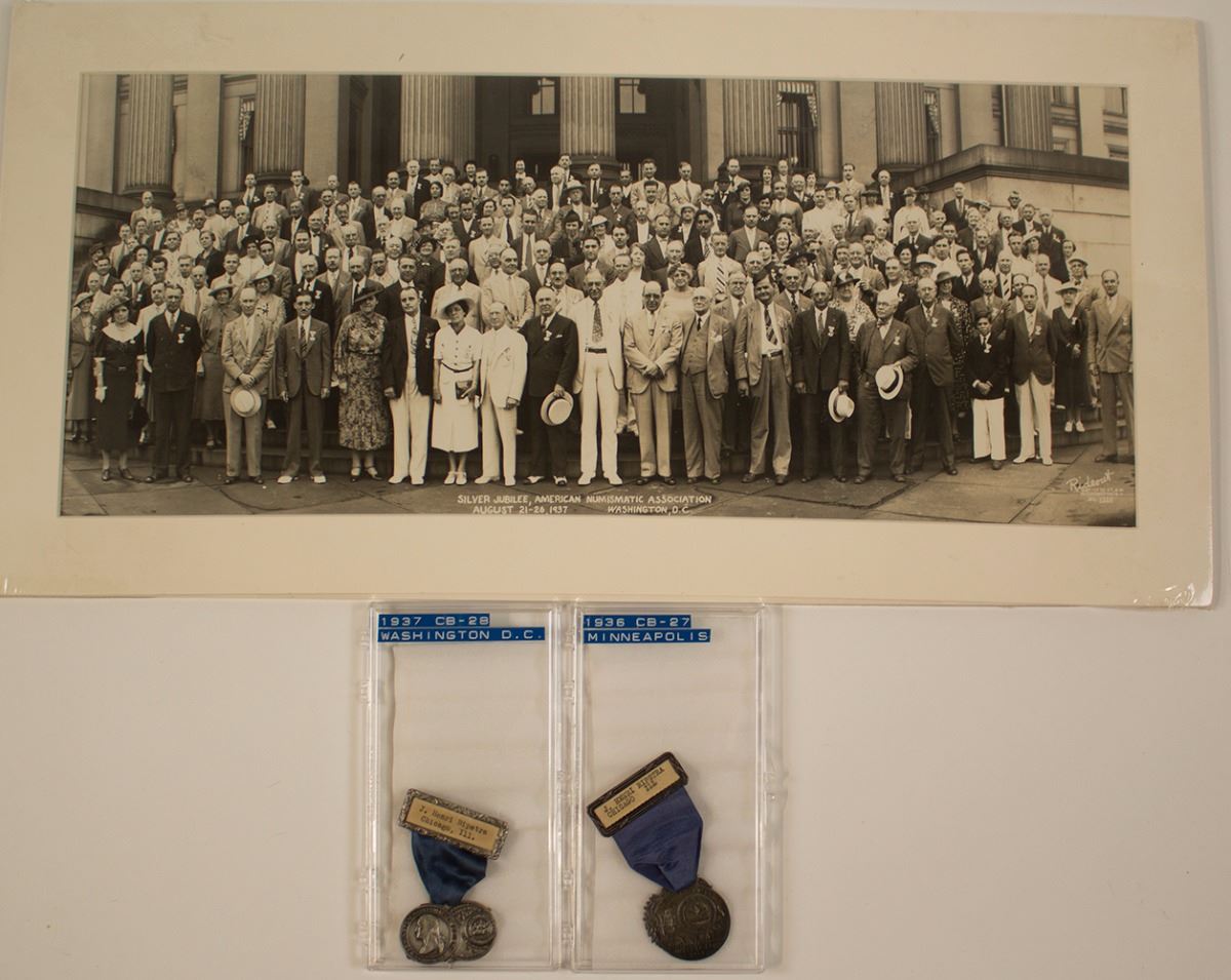 This lot contains convention badges from the 1936 Minneapolis convention and the 1937 Washington DC convention. Both badges were from J Henri Ripstra, ANA president 1937 to 1939. Also includes a photograph of the convention attendees. (Don Young Collection) State: City: Date: FHWAC#: 43439
