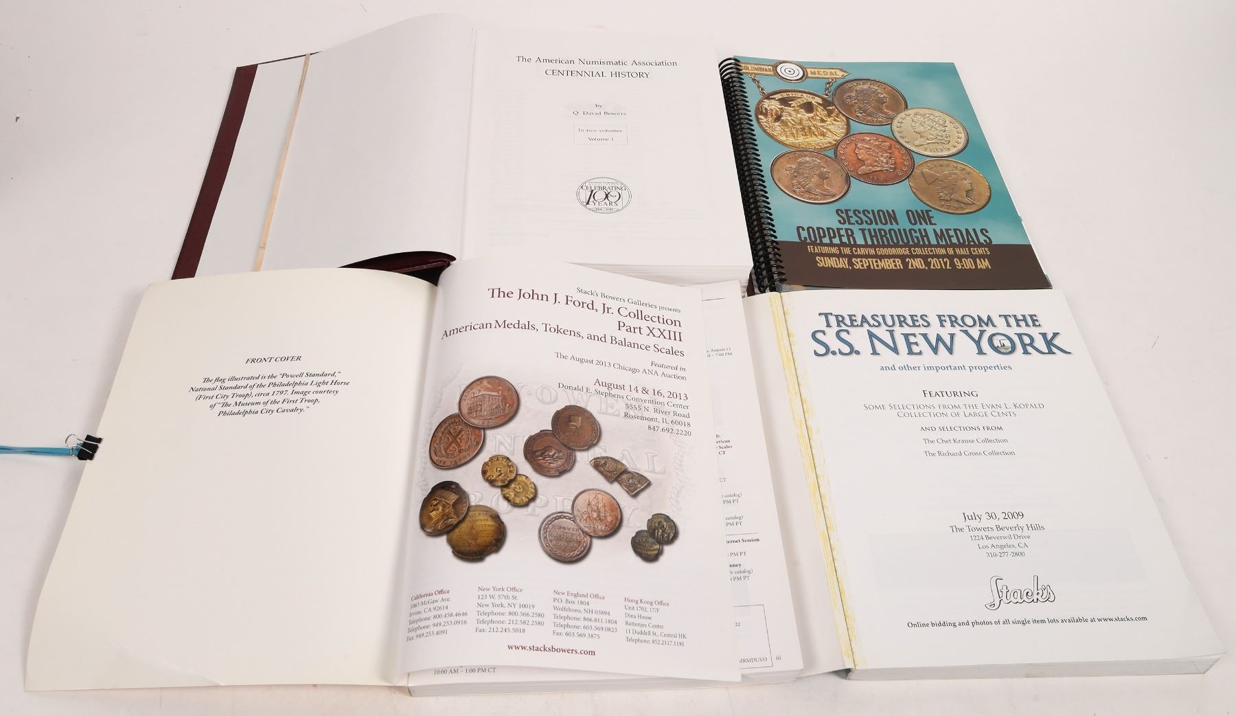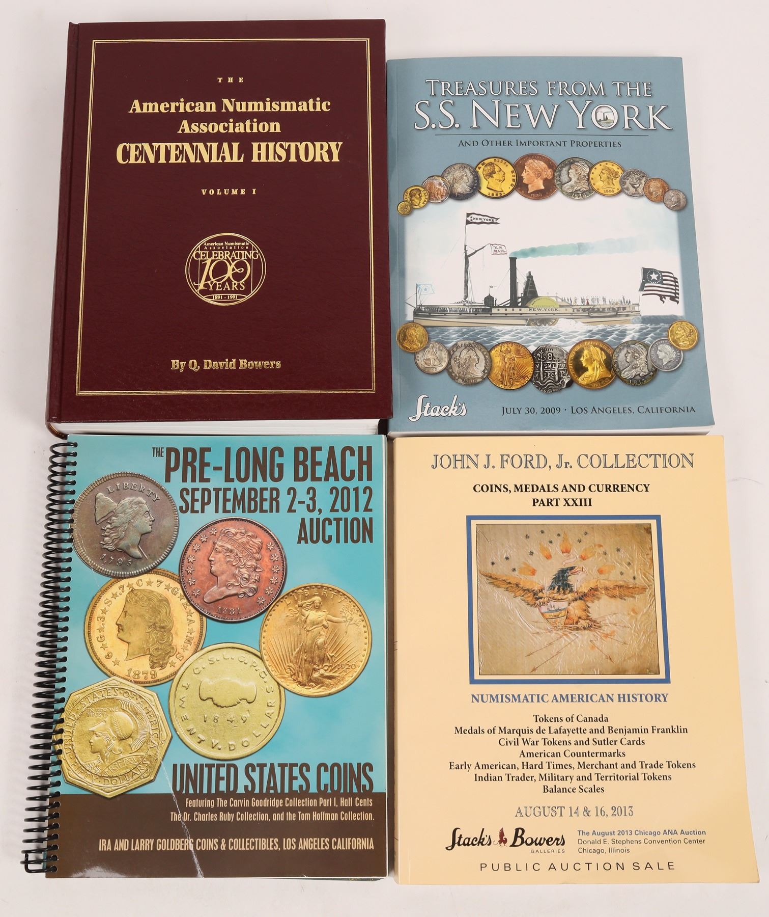 Lot of four numismatic books: 1) The American Numismatic Association Centennial History Volume I" by Q. David Bowers, hardcover, 1991, 842 pages. 2) "John J. Ford, Jr. Collection Part XXIII" by Stack's Bowers, 2013; softcover coin auction, 456 pages. 3) "Treasures from the S. S. New York," Stack's, 2009, softcover coin auction, 372 pages. 4) "Pre-Long Beach September 2-3, 2012 Auction," Ira and Larry Goldberg Coins, softcover coin auction, 286 pages.