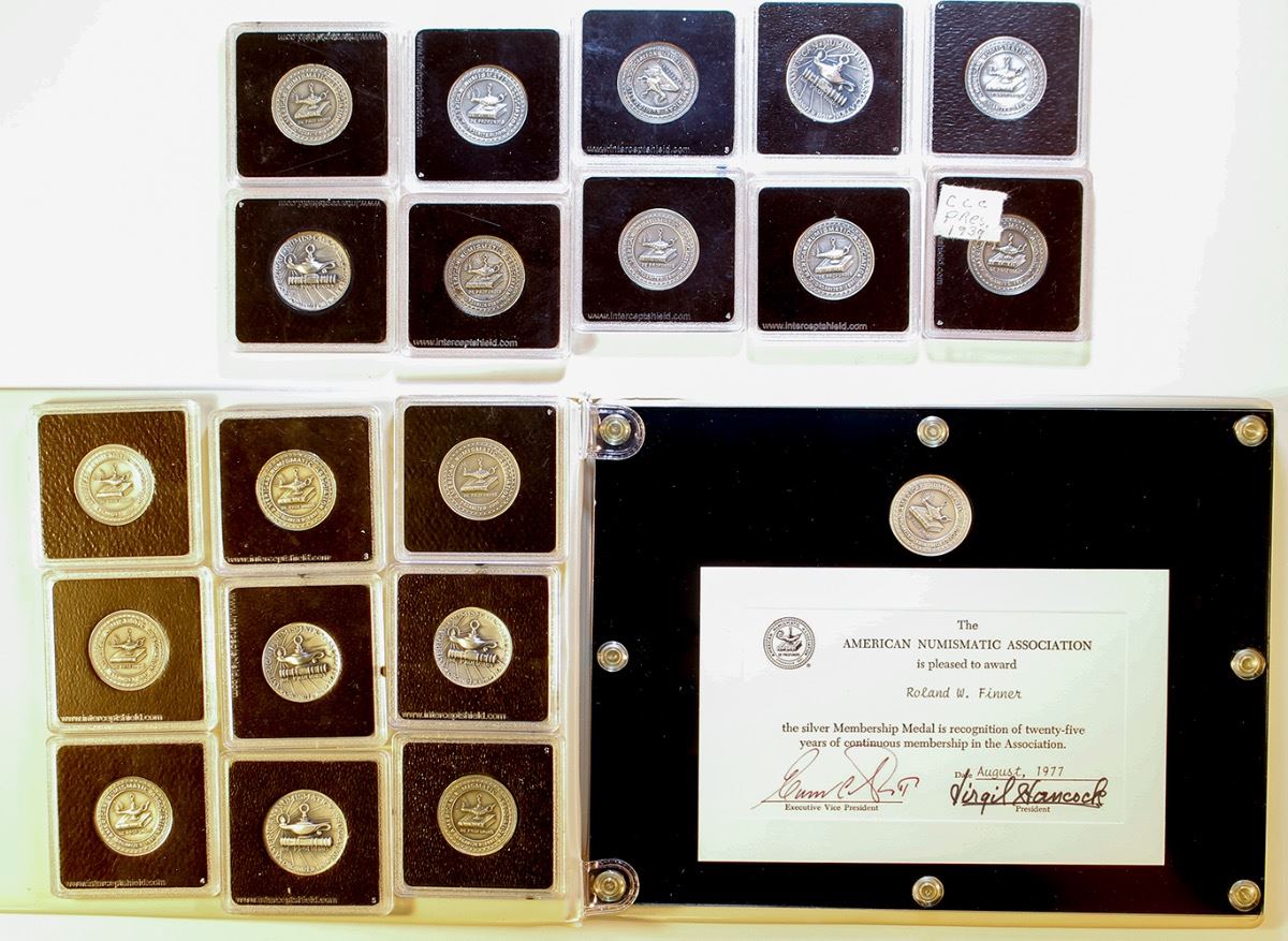 Group of 20 ANA silver 25 year membership medals. This interesting group contains 14 silver medals issued to some of the Who's Who in numismatics. The list includes Mr. and Mrs. B Max Mehl, the Criswells, Paul Kagin, Don Young and others. The group also contains an additional five non-engraved 25 year member pieces. The last part of the lot is a 25 year medallion given to Roland Thinner in 1977 in the original capital plastics case. This is a nice historic group. (Don Young Collection) State: City: Date: FHWAC#: 43160