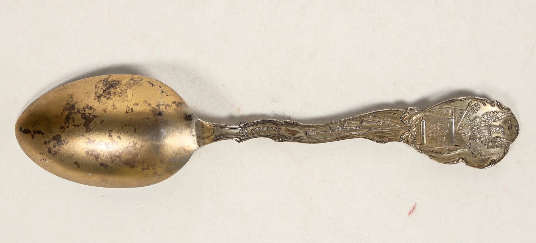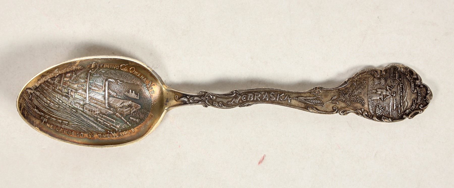 Nebraska souvenir spoon of American Smelting and Refining Co.. Ladle die cut of smelting plant, "The Largest In The World" at that time.