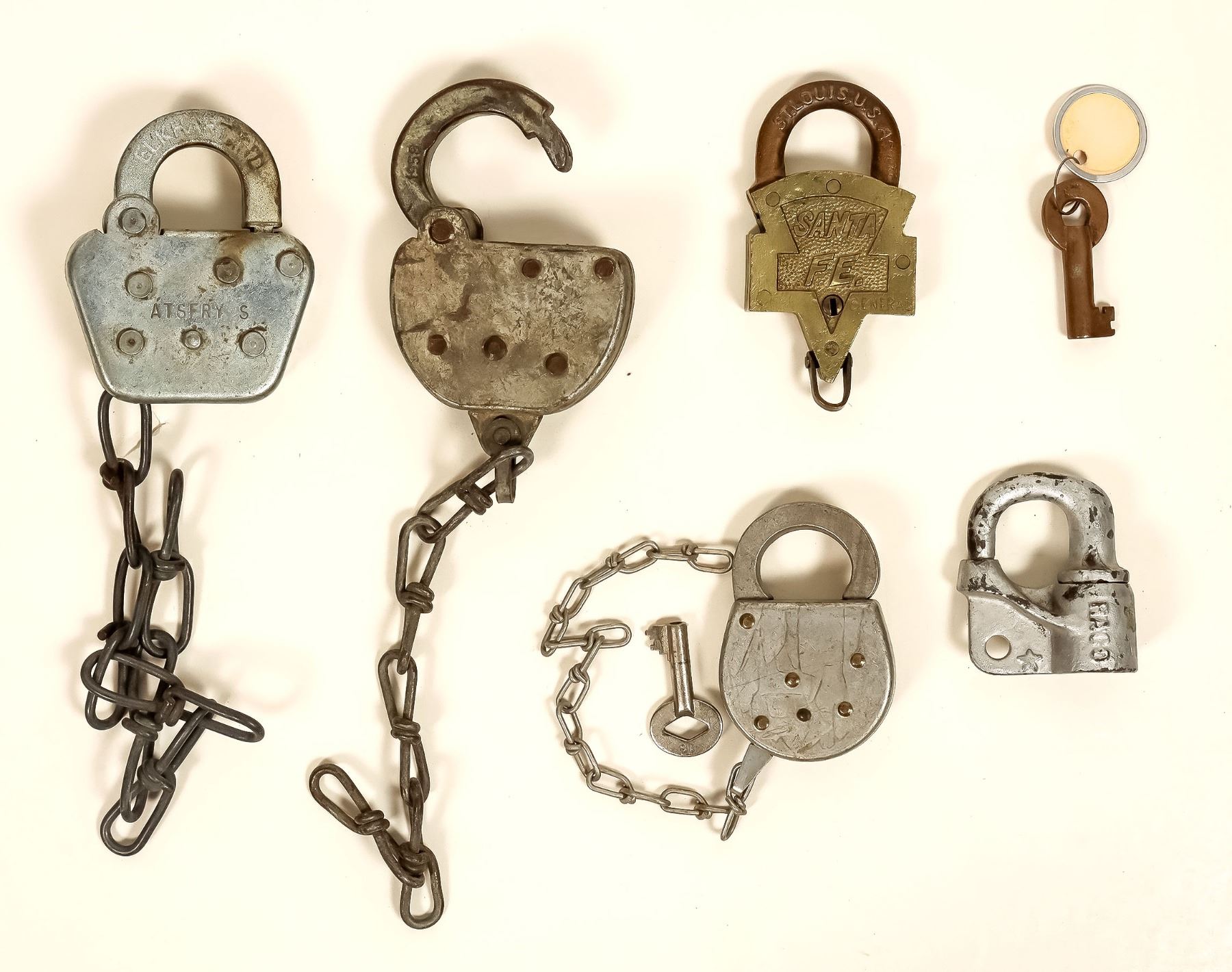 AT&SF Railroad locks, a couple of switch locks and a Keen Kutter design. Included is one key (Doesn't fit locks) and a stamped mini-sledge. All seem to be in nice condition. Please see photos for more details.
