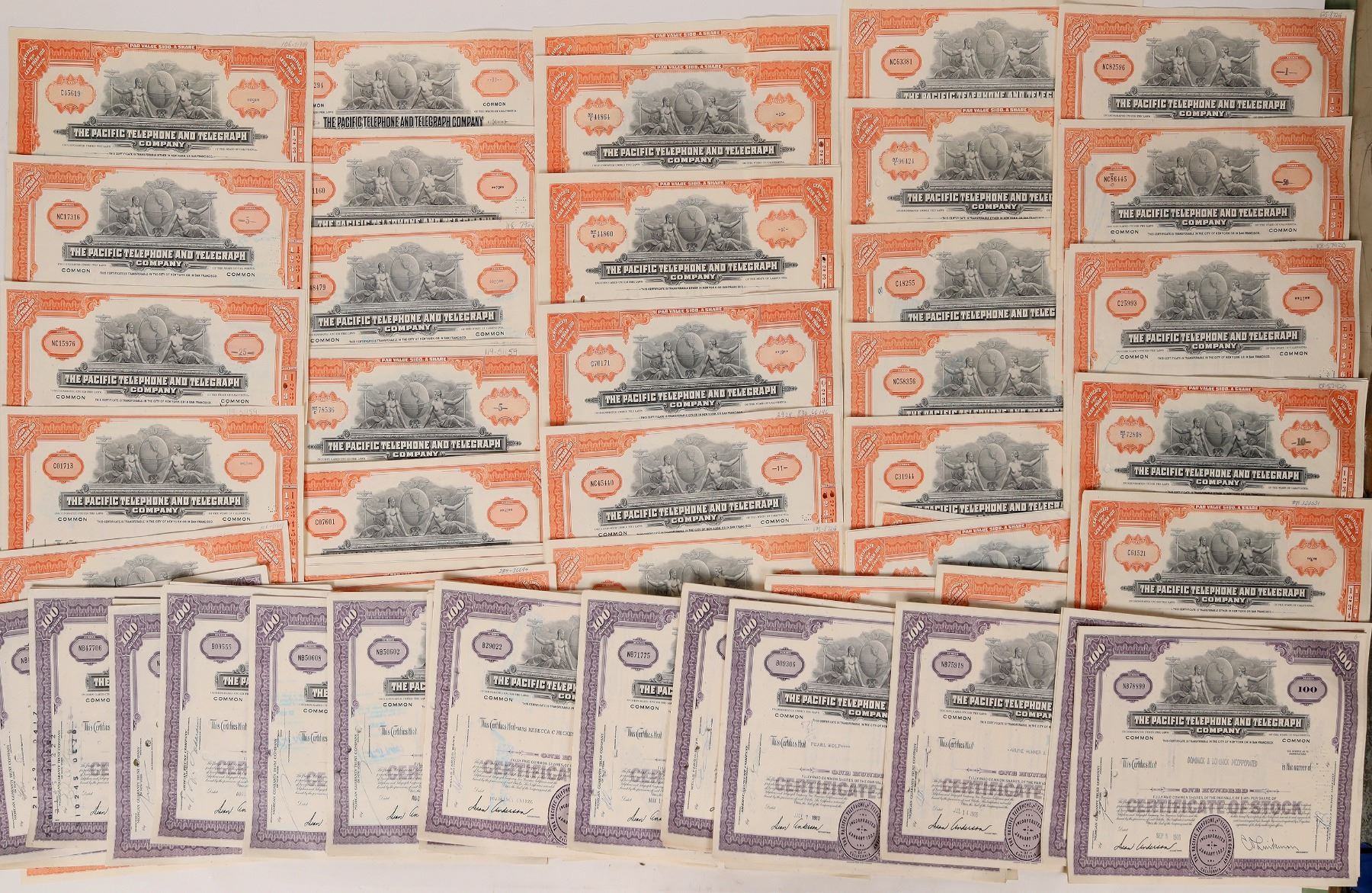 Approximately 200 common stock certificates issued by The Pacific Telephone and Telegraph Company. All appear to be cancelled and are in nice condition. Please see photos for more details. California San Francisco 1900s