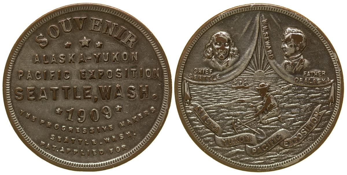 Obv.: Alaska Yukon Pacific Exposition. Rev.; Souvenir / Alaska-Yukon / Pacific Exposition / Seattle, WASH / 1909 / The Progressive Makers Seattle, Wash. Pat. Applied For / Rd. 35mm HK-363 City: Seattle State: Washington Date: 1909 ID# 45433