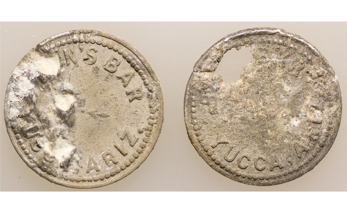 Two dug tokens: 1) Yucca, AZ / Ben's Bar // GF 5c IT. Token is missing some of front side, back is mostly intact. 2) Yucca, AZ / Ben's Bar // GF 5c IT. Hole in token, very worn.